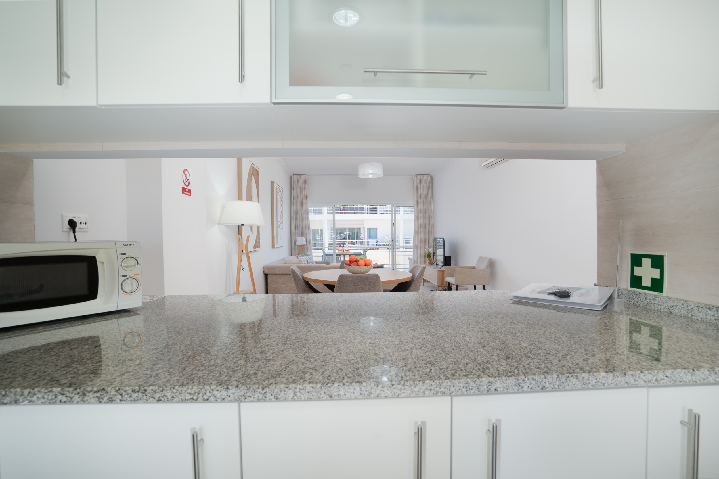 El acogedor vestíbulo de entrada conduce en primer lugar a la cocina de generosas dimensiones y bien equipada con todos los electrodomésticos y utensilios principales incluidos. Más adelante, el salón/comedor de planta abierta espera darle la bienvenida, lujosamente amueblado con cómodos sofás, un gran mueble para TV y alacena de madera negra pulida, complementados con una mesa de comedor y sillas a juego. La luz irradia a través de las ventanas del patio del salón que se abren a un balcón con mesa y sillas de comedor, ideal para el desayuno o un aperitivo antes de la cena. A la derecha, 2 dormitorios de generosas dimensiones incluyen una habitación king size y una habitación doble, una con baño privado con ducha y un baño adicional independiente. Se llega a la piscina para residentes mediante ascensor o escaleras, ideal para que los adultos hagan ejercicio matutino y para que jueguen los niños, antes o después de la playa.