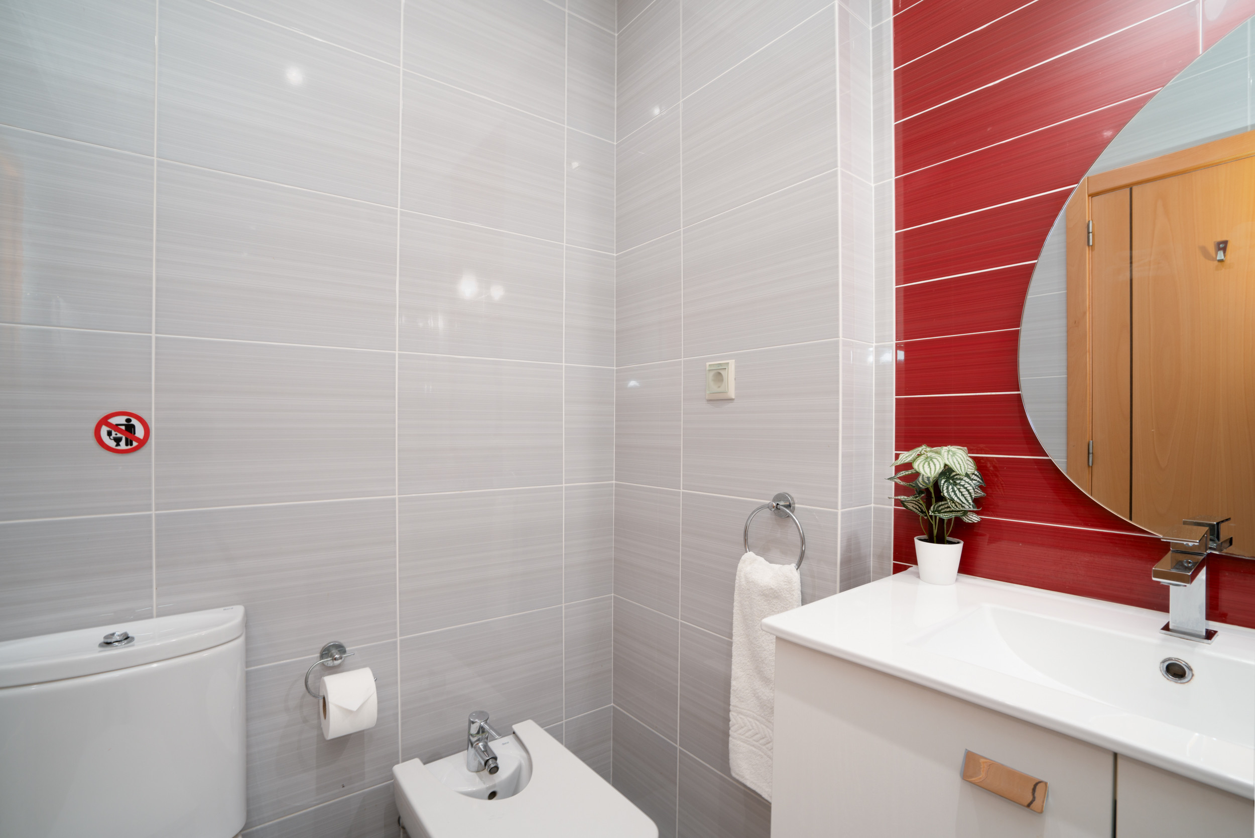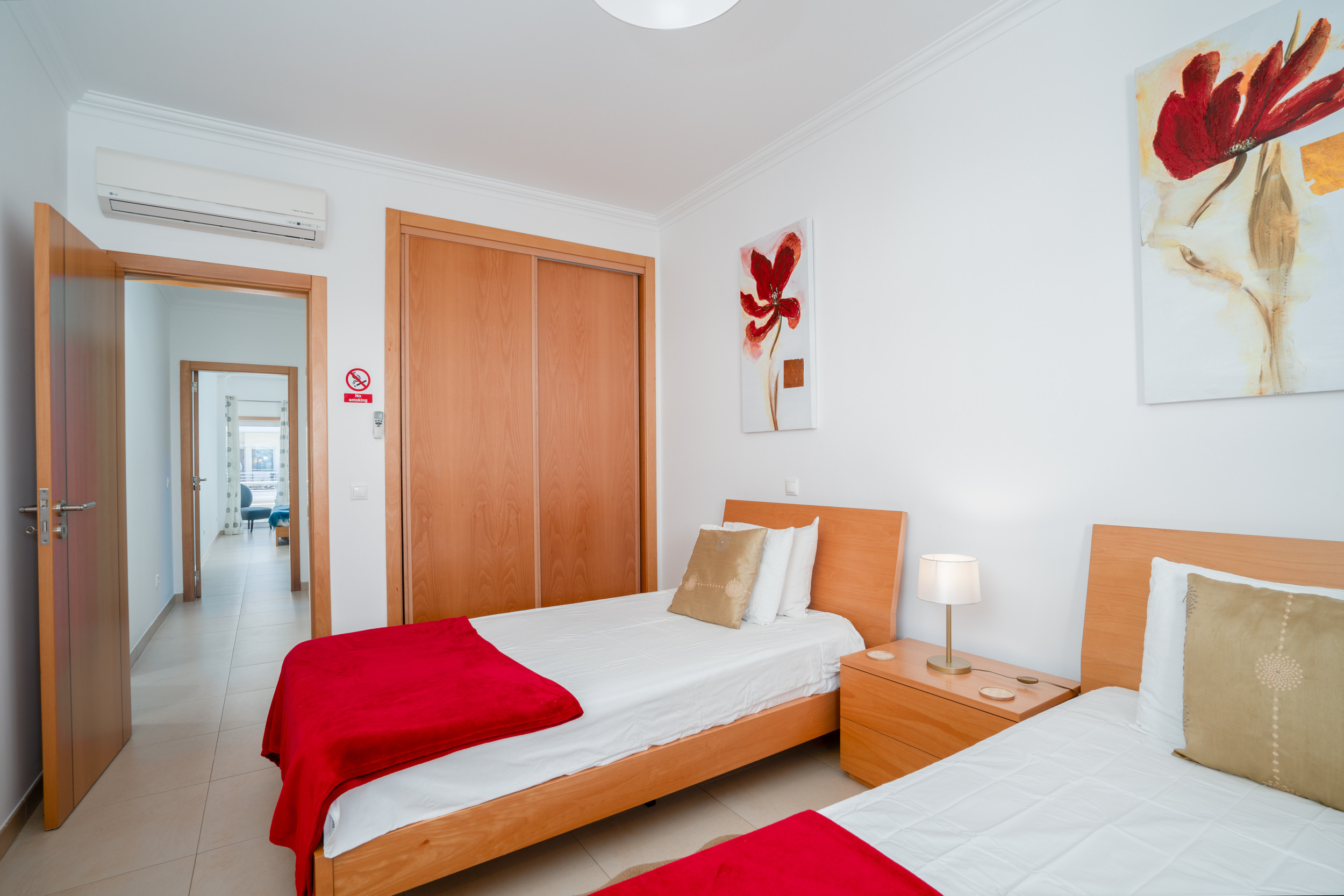 Acceda a un espacio diáfano y luminoso desde la entrada, con una amplia zona de comedor que cuenta con una mesa de madera, sofás cómodos, televisión de pared y Wi-Fi. La cocina totalmente equipada tipo galera facilita la preparación de comidas. El apartamento tiene 2 dormitorios: un dormitorio con cama king-size y baño en suite, y una habitación con dos camas con un baño separado. Armarios empotrados y aire acondicionado en toda la vivienda garantizan el confort.