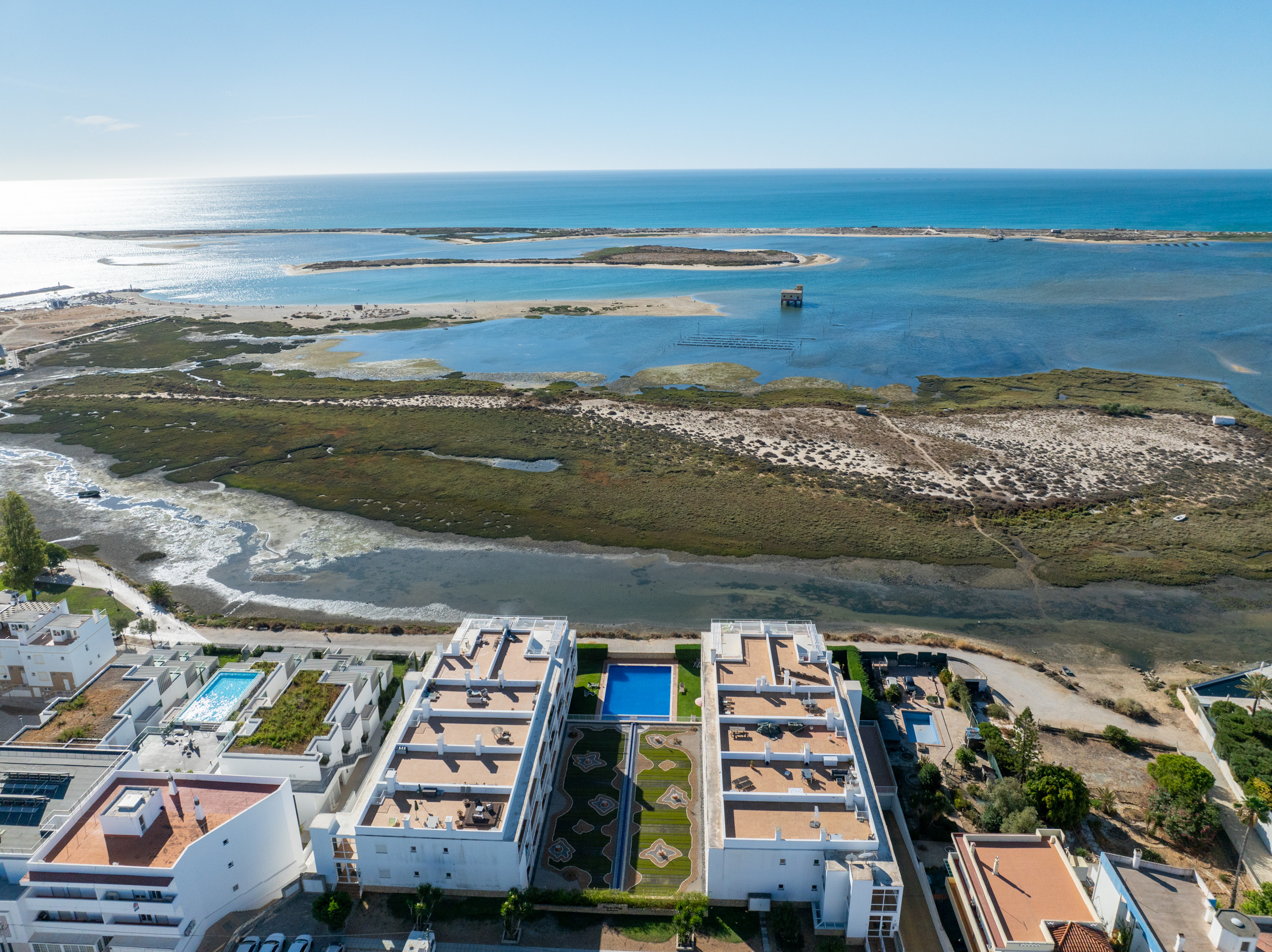 Disfrute de una hermosa terraza envolvente con vistas a la piscina, la Ria Formosa y el Océano Atlántico. Dos terrazas ofrecen opciones: relájese directamente fuera del salón con tumbonas, mesa de comedor y sillas, perfectas para comer al aire libre en cualquier momento del día, o suba por la escalera de caracol hasta la terraza superior para tomar el sol y disfrutar de las vistas más impresionantes. Los huéspedes tienen acceso a una piscina exclusiva para residentes, con tumbonas incluidas. Ya sea que esté disfrutando de un refrescante baño matutino o descansando después de un día en la playa, es un lugar encantador para relajarse y refrescarse.