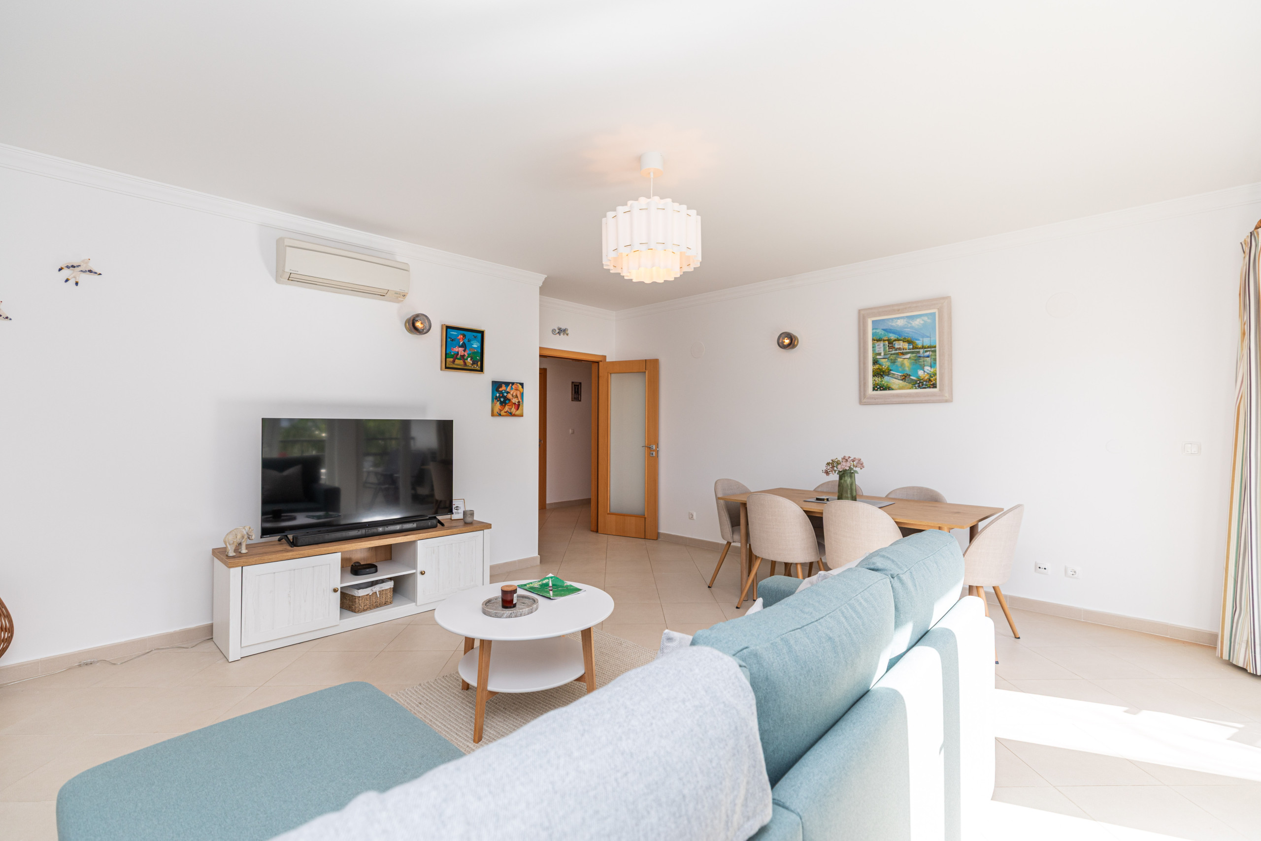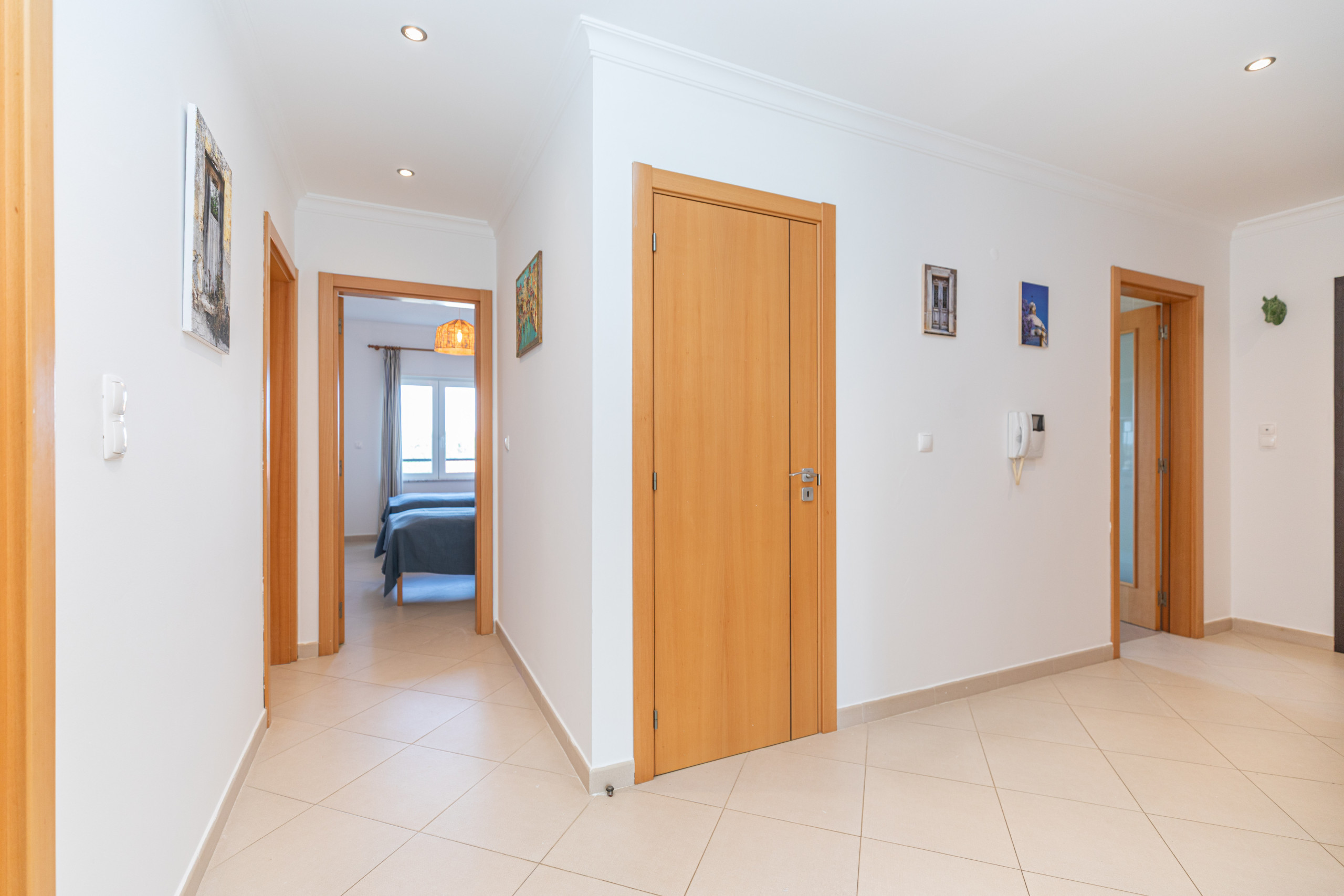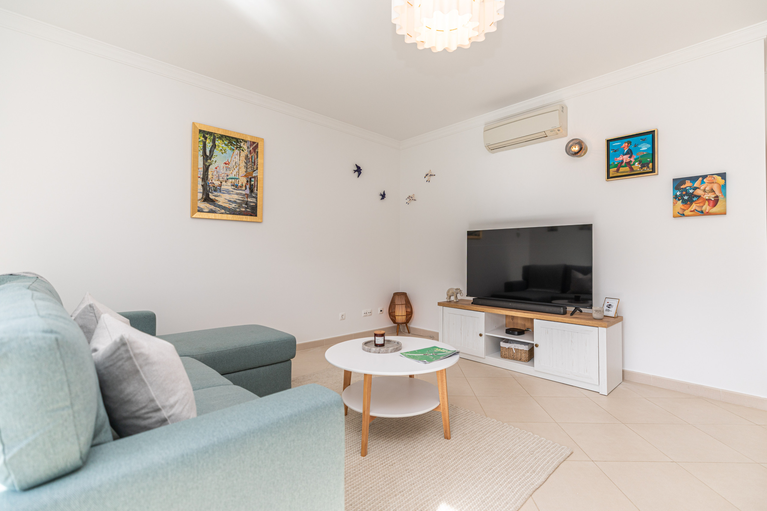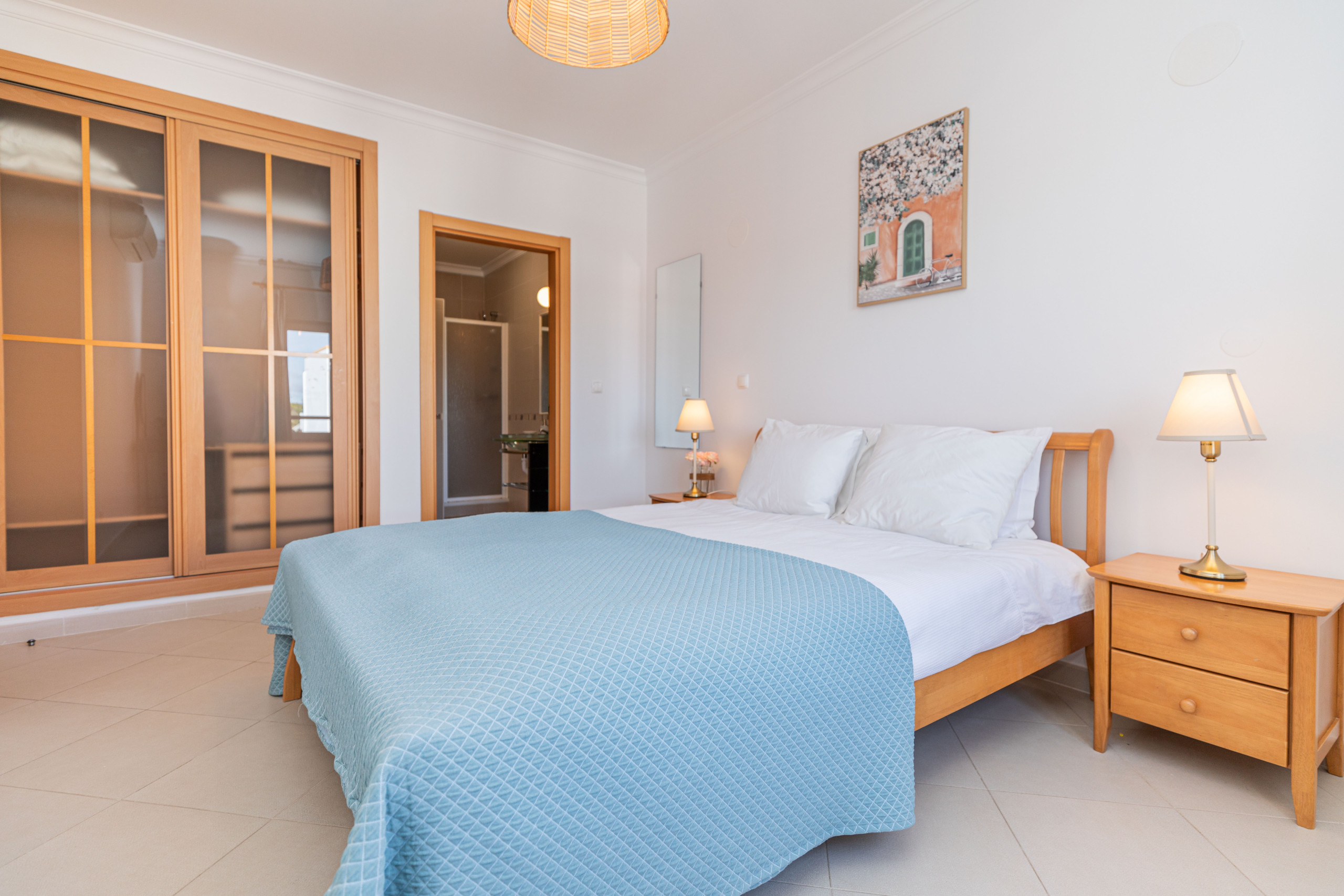 En la parte trasera del apartamento, encontrará un dormitorio espacioso, con una cama king-size de peluche, armarios empotrados para sus artículos esenciales de vacaciones y aire acondicionado refrescante para mantenerse fresco en los soleados días del Algarve. Justo al lado, el baño ofrece una bañera completa con ducha overhead, ideal para un remojo relajante o un rápido refrescamiento después de un día en la playa.