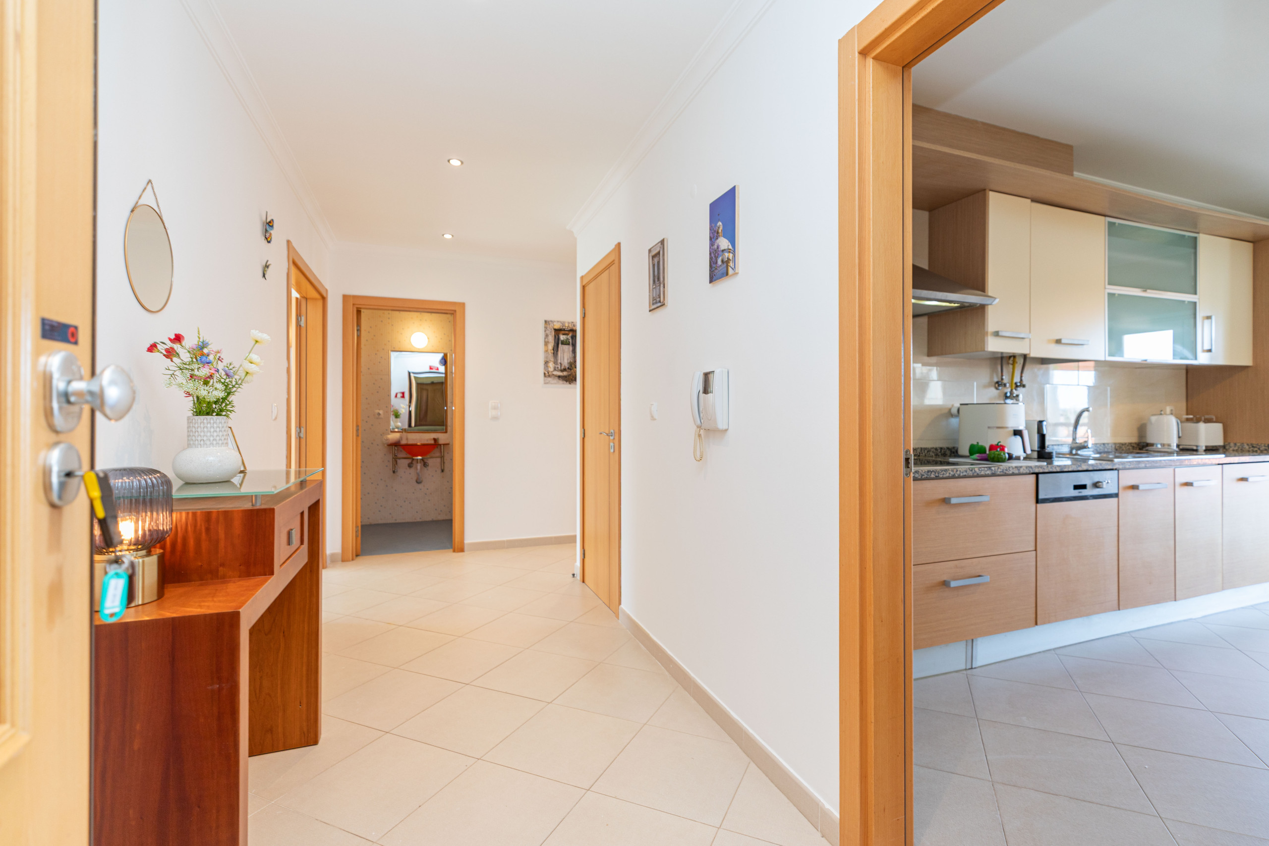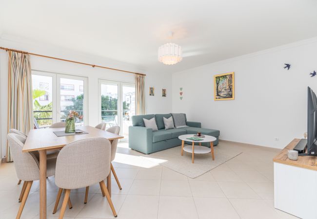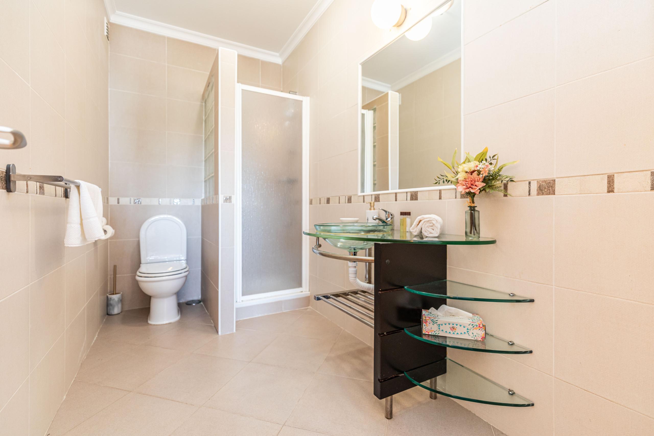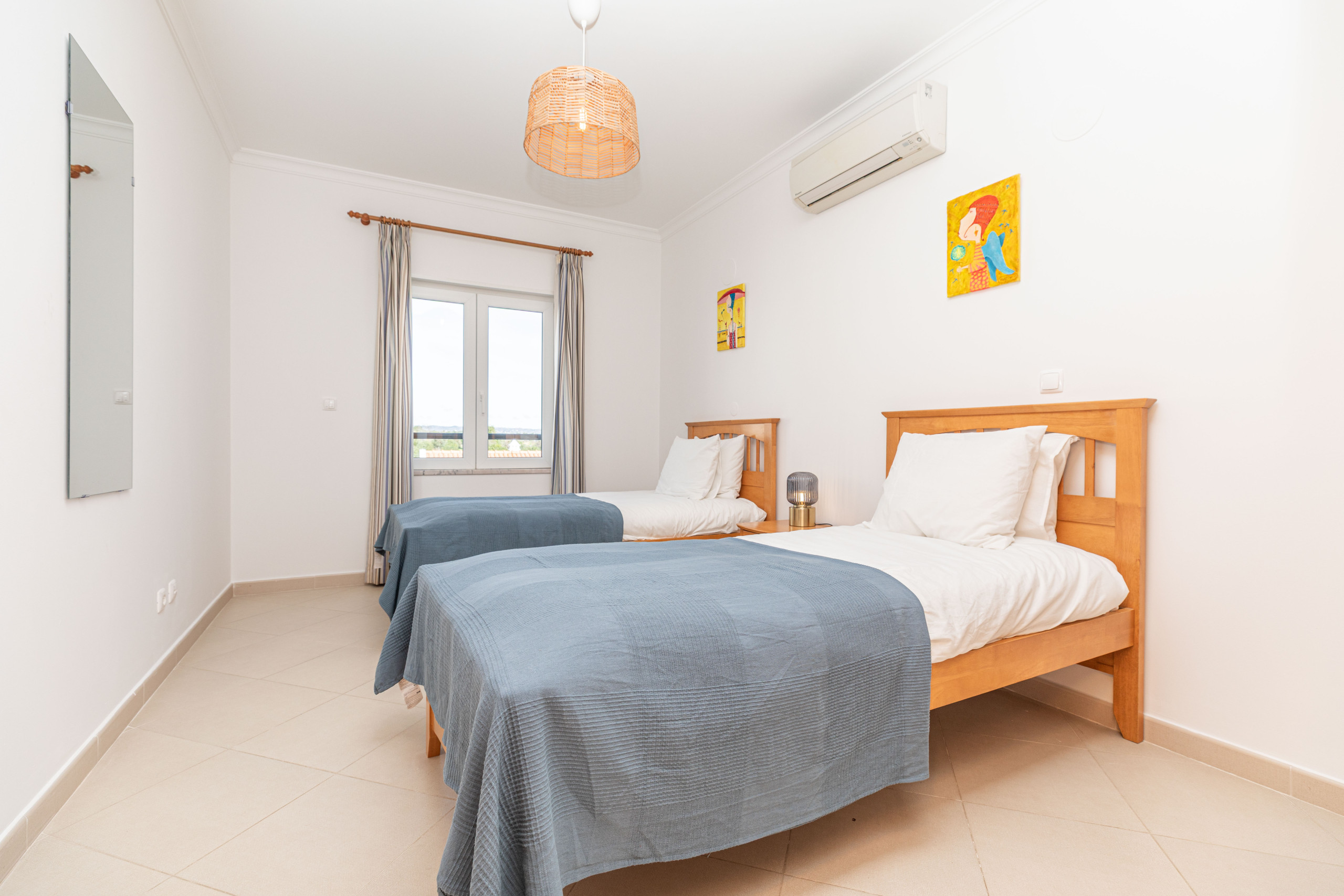 En la parte trasera del apartamento, encontrará un dormitorio espacioso, con una cama king-size de peluche, armarios empotrados para sus artículos esenciales de vacaciones y aire acondicionado refrescante para mantenerse fresco en los soleados días del Algarve. Justo al lado, el baño ofrece una bañera completa con ducha overhead, ideal para un remojo relajante o un rápido refrescamiento después de un día en la playa.