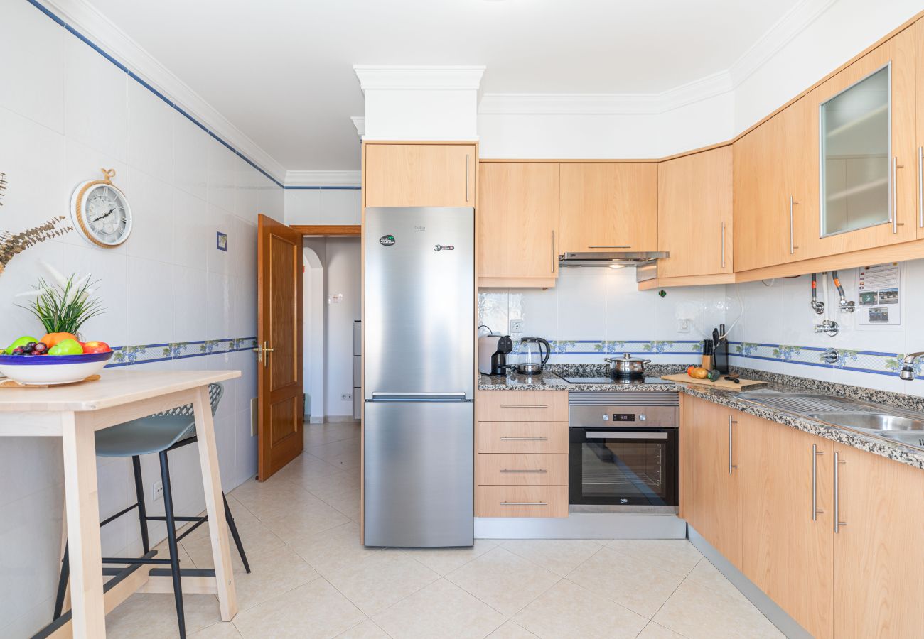 En la parte trasera del apartamento, encontrará un dormitorio espacioso, con una cama king-size de peluche, armarios empotrados para sus artículos esenciales de vacaciones y aire acondicionado refrescante para mantenerse fresco en los soleados días del Algarve. Justo al lado, el baño ofrece una bañera completa con ducha overhead, ideal para un remojo relajante o un rápido refrescamiento después de un día en la playa.