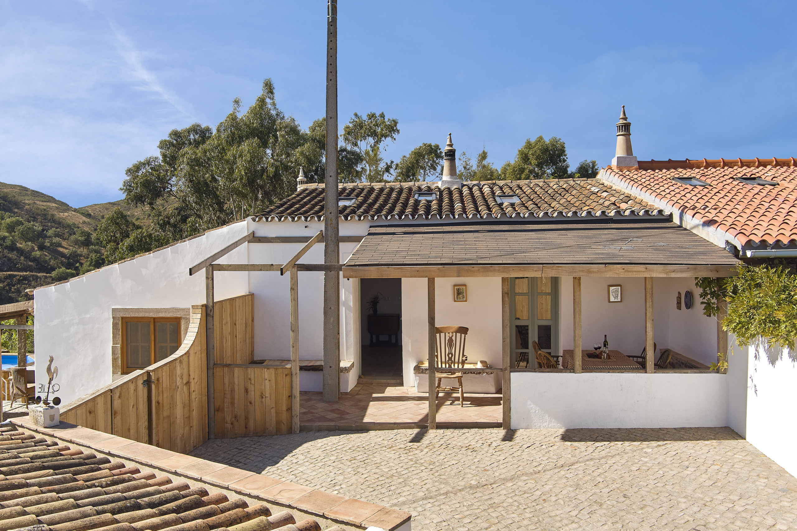 Fuera, una gran terraza con una mesa de comedor de madera, asientos de banco y una piscina de inmersión sobre el nivel del suelo proporciona el escenario perfecto para desayunos soleados, almuerzos relajantes o cenas al aire libre. La propiedad principal está toda en un solo nivel, con fácil acceso en todo momento, y al anexo se accede a través de un camino de piedra que tiene varios escalones pequeños.