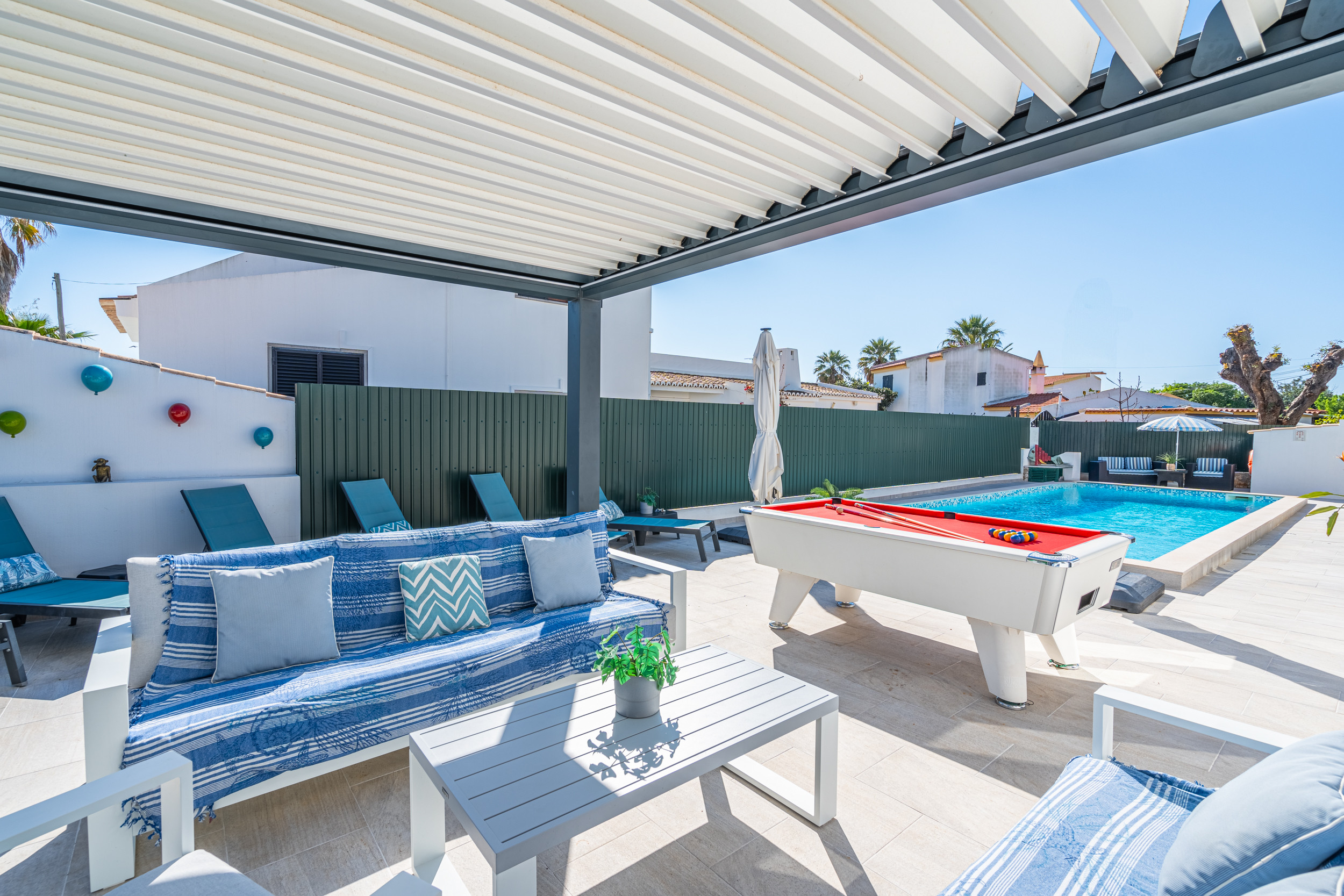 Villa elegante situada cerca del centro de Tavira. La decoración interior es contemporánea y vibrante, con áreas de estar de planta abierta y una cocina, comedor y espacio de trabajo sobresalientes. 6 huéspedes están cómodamente alojados, con 1 dormitorio convenientemente ubicado en la planta baja. Las comodidades exteriores incluyen una piscina preciosa, mesa de billar, comedor al aire libre y un espacio de jardín seguro. Un paseo de 20 minutos lo lleva a restaurantes, tiendas tradicionales y el ferry a la hermosa Isla de la Playa de Tavira
