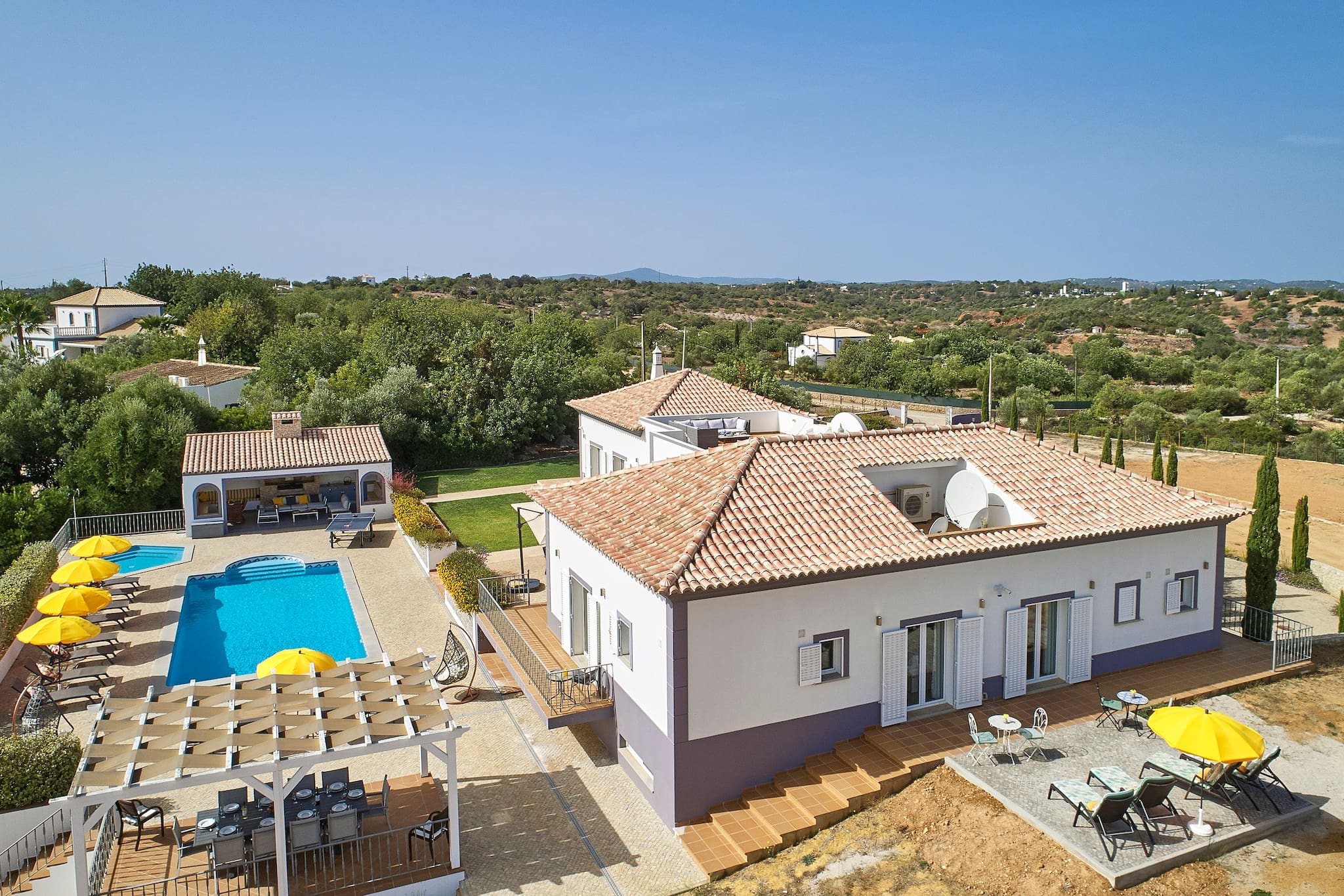 Piscina Privada de 12m x 5m, Piscina Infantil Separada, 6 dormitorios todos con baños en suite, Salón de Juegos, Salón Formal, Cocina Grande, Sala de Cine, Tenis de Mesa, Terrazas Variadas de Sol/Comedor, Cocina-Comedor junto a la Piscina con Horno de Pizza y una gran Barbacoa Tradicional