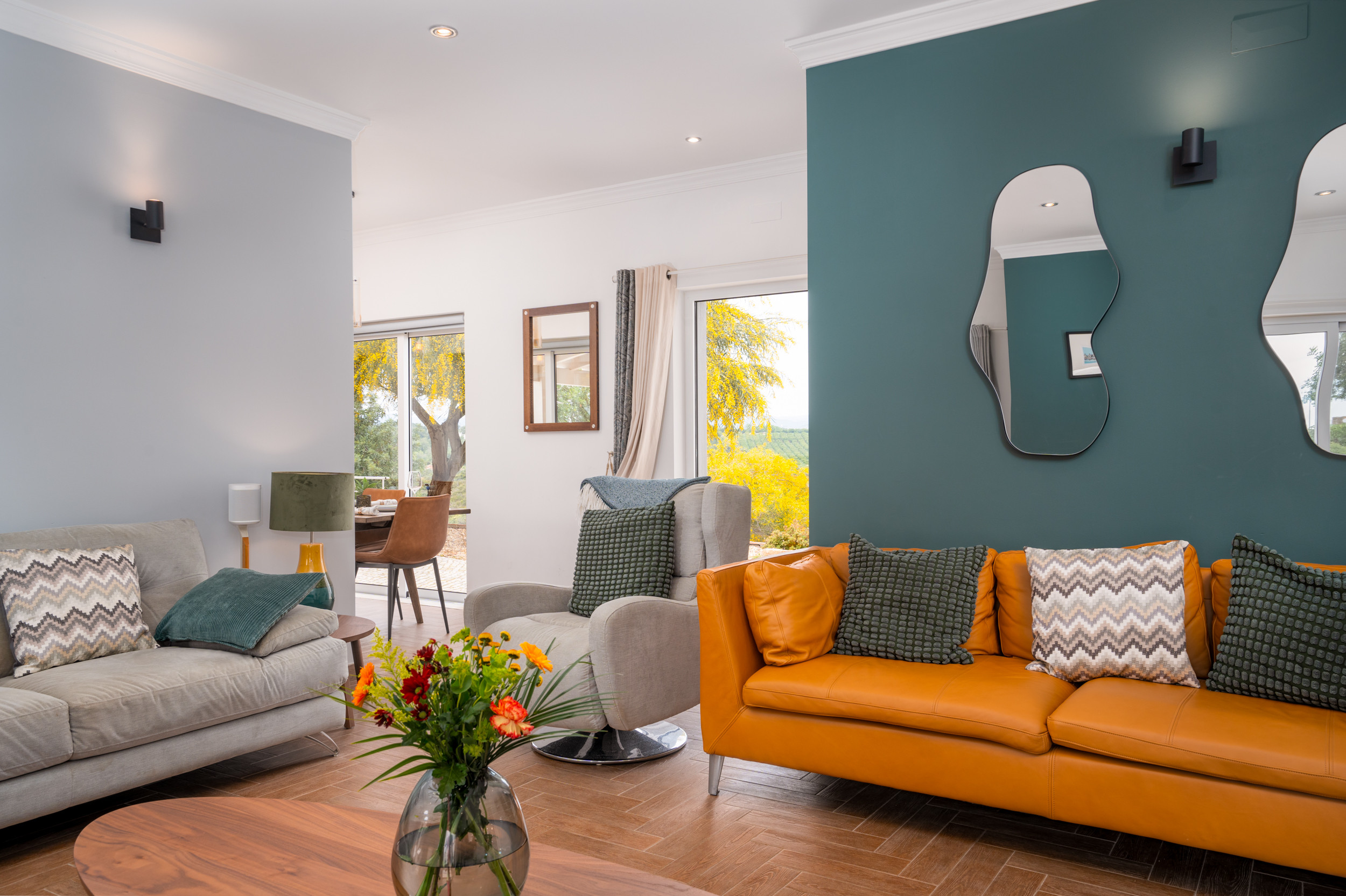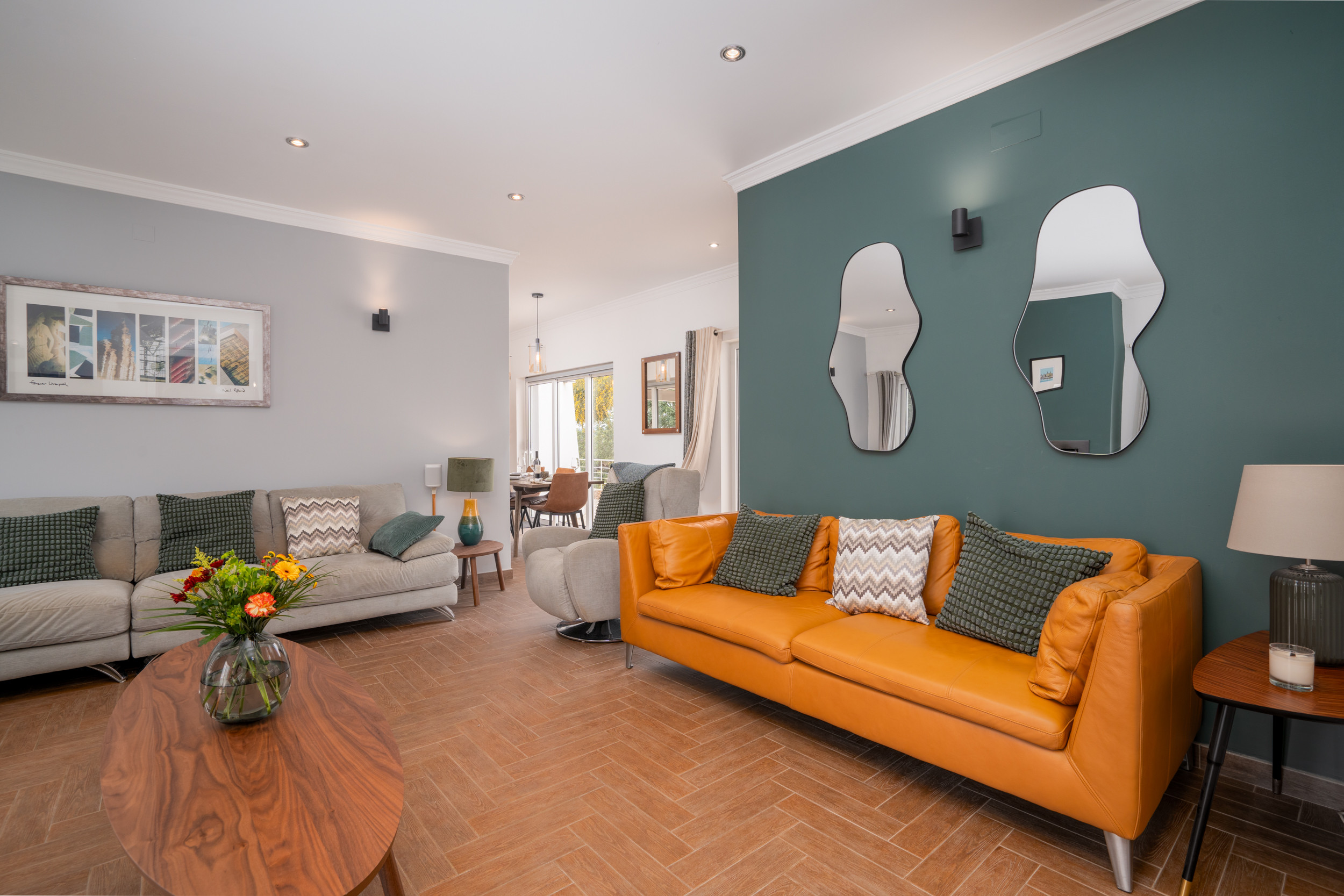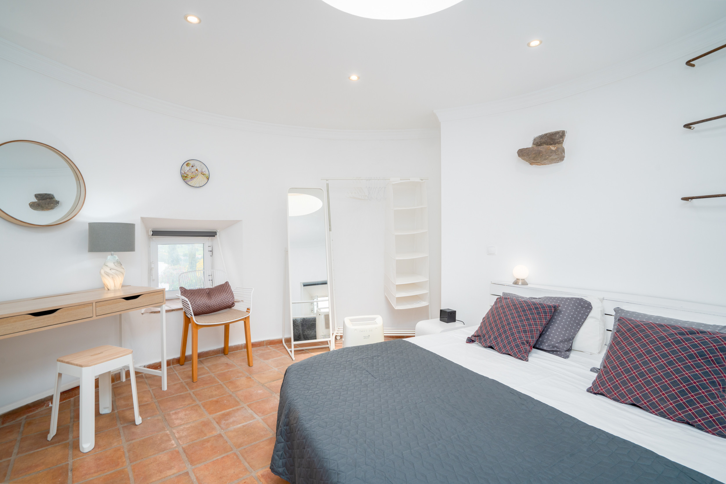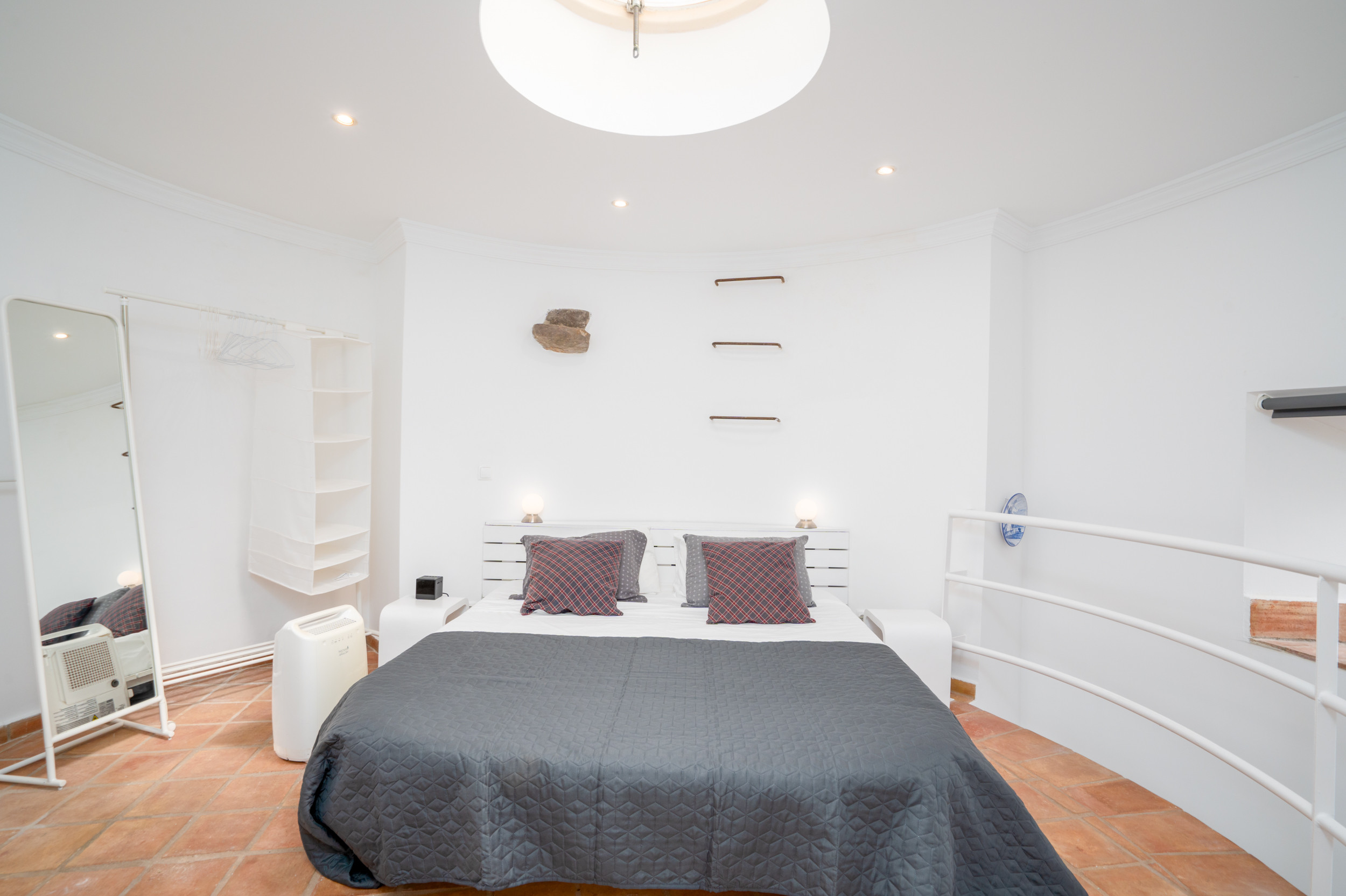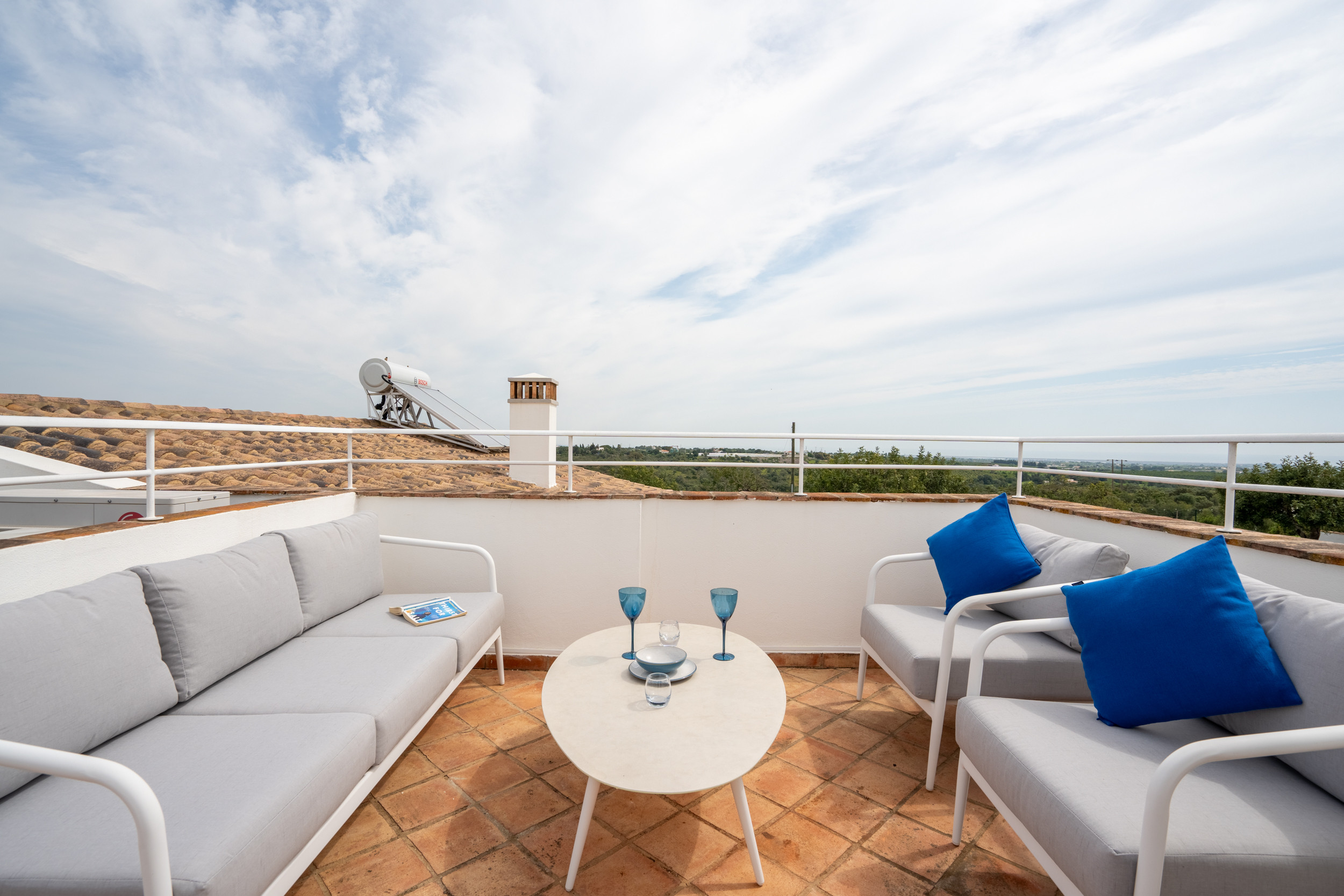 PLANTA BAJA - Al entrar por la entrada privada con puerta, un pasillo ancho le da la bienvenida cálidamente, con habitaciones que se ramifican a ambos lados. Posicionado convenientemente para aquellos que prefieren alojamientos en planta baja, una habitación con dos camas espera a la izquierda, mientras que una habitación doble espera a la derecha. Avanzando, encontrará la luminosa y espaciosa sala de estar y comedor combinados, que ofrece un respiro del sol y vistas cautivadoras. Aquí, puede relajarse o disfrutar de una sofisticada experiencia gastronómica en la gran mesa de madera acompañada de sillas a juego. Junto a la sala de estar y el comedor, la cocina totalmente equipada se une sin problemas a una terraza superior para comidas al aire libre, sombreada y convenientemente ubicada junto a una barbacoa tradicional y un balcón para la preparación de alimentos. Este espacio es perfecto para almuerzos relajados y para disfrutar de las maravillosas vistas que abarcan los tejados de Tavira, extendiéndose majestuosamente hacia el mar.