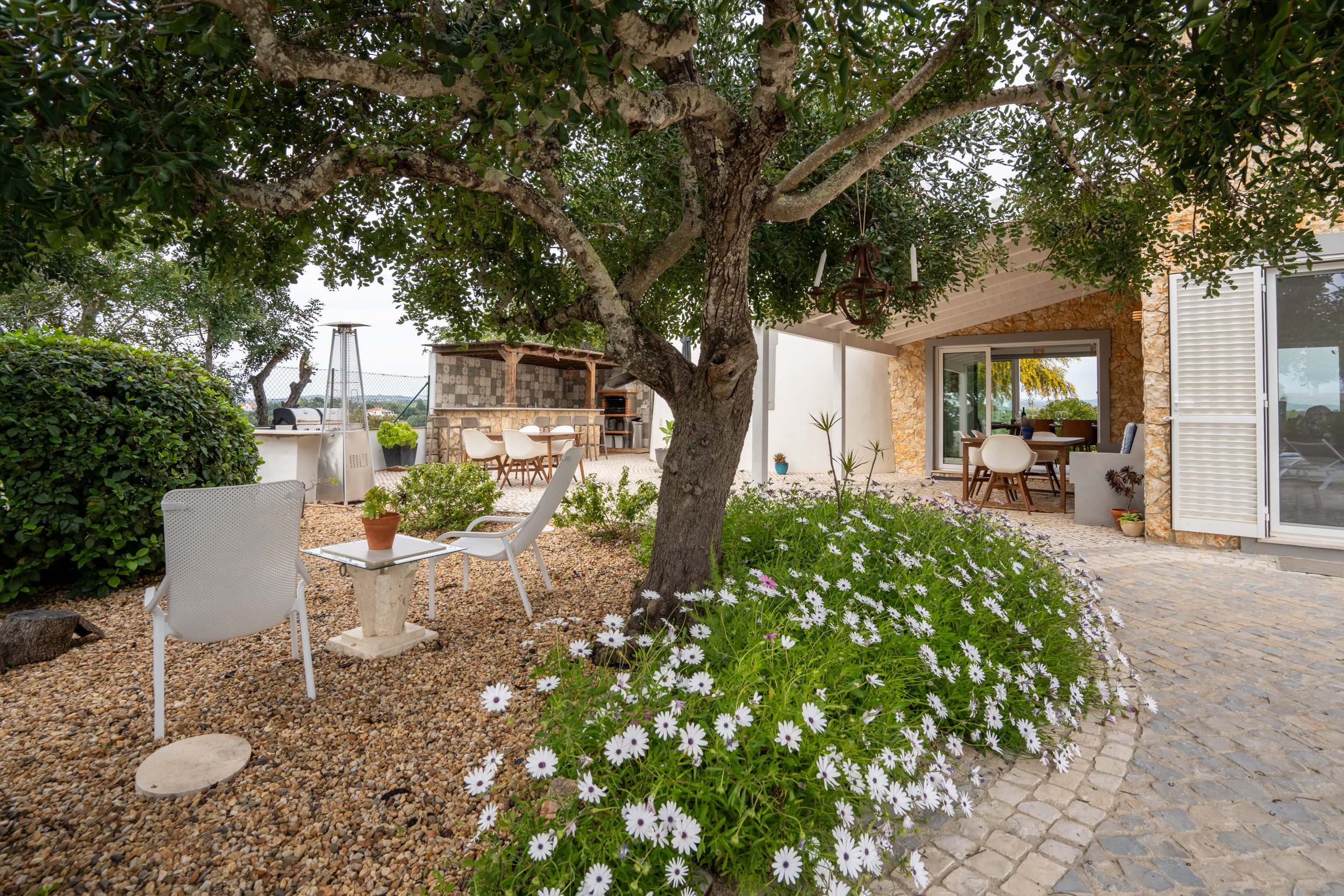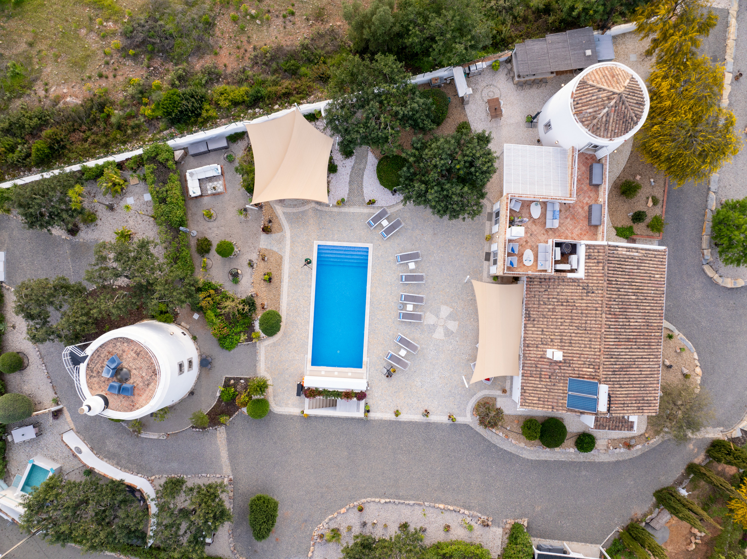 PLANTA BAJA – La planta baja de la villa comprende la piscina y las terrazas. Puede seguir ya sea el perímetro inclinado lleno de exuberante vegetación arbustiva o tomar las escaleras desde el patio de la cocina, según su preferencia. El ambiente junto a la piscina se realza con el paisaje arbolado circundante y está adornado con un delicioso pavimento de calçada, proporcionando un espacio completamente cerrado y seguro para que los niños jueguen. Hay una selección de tumbonas y sillas disponibles para su relajación, mientras que una mesa de pedestal robusta y sillas, fabricadas en piedra sólida, están perfectamente colocadas para disfrutar de refrigerios y bebidas junto a la piscina, añadiendo encanto y comodidad a esta área.