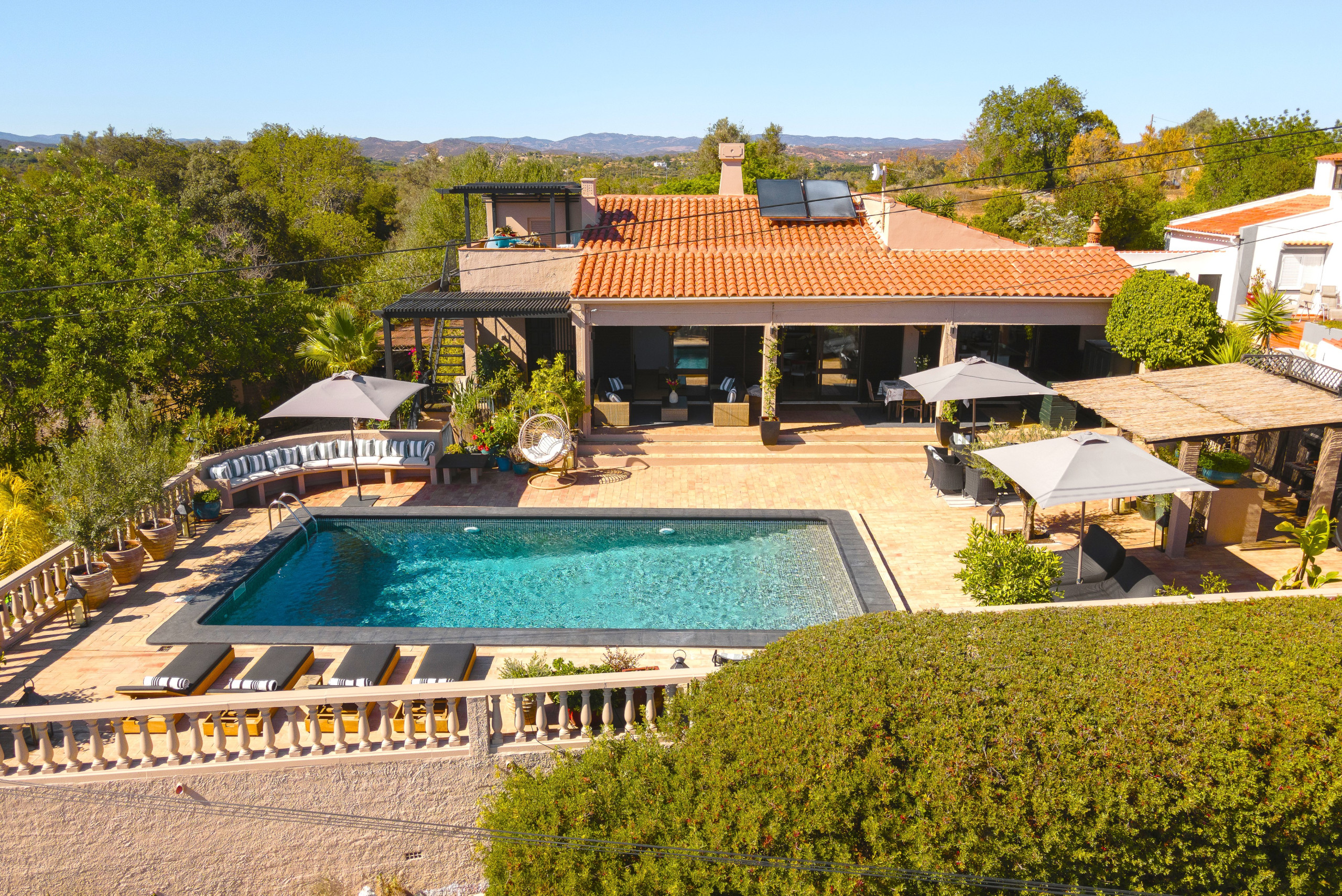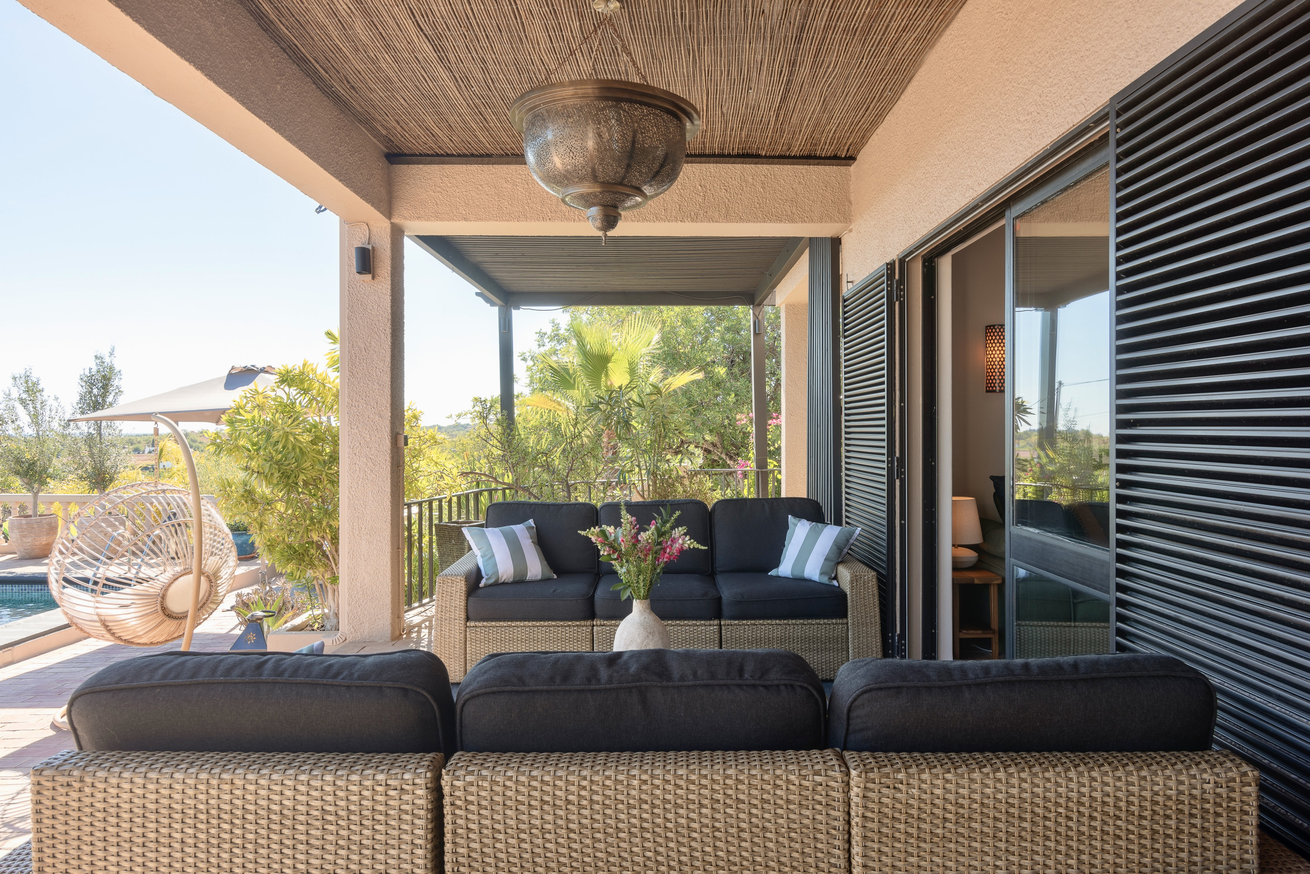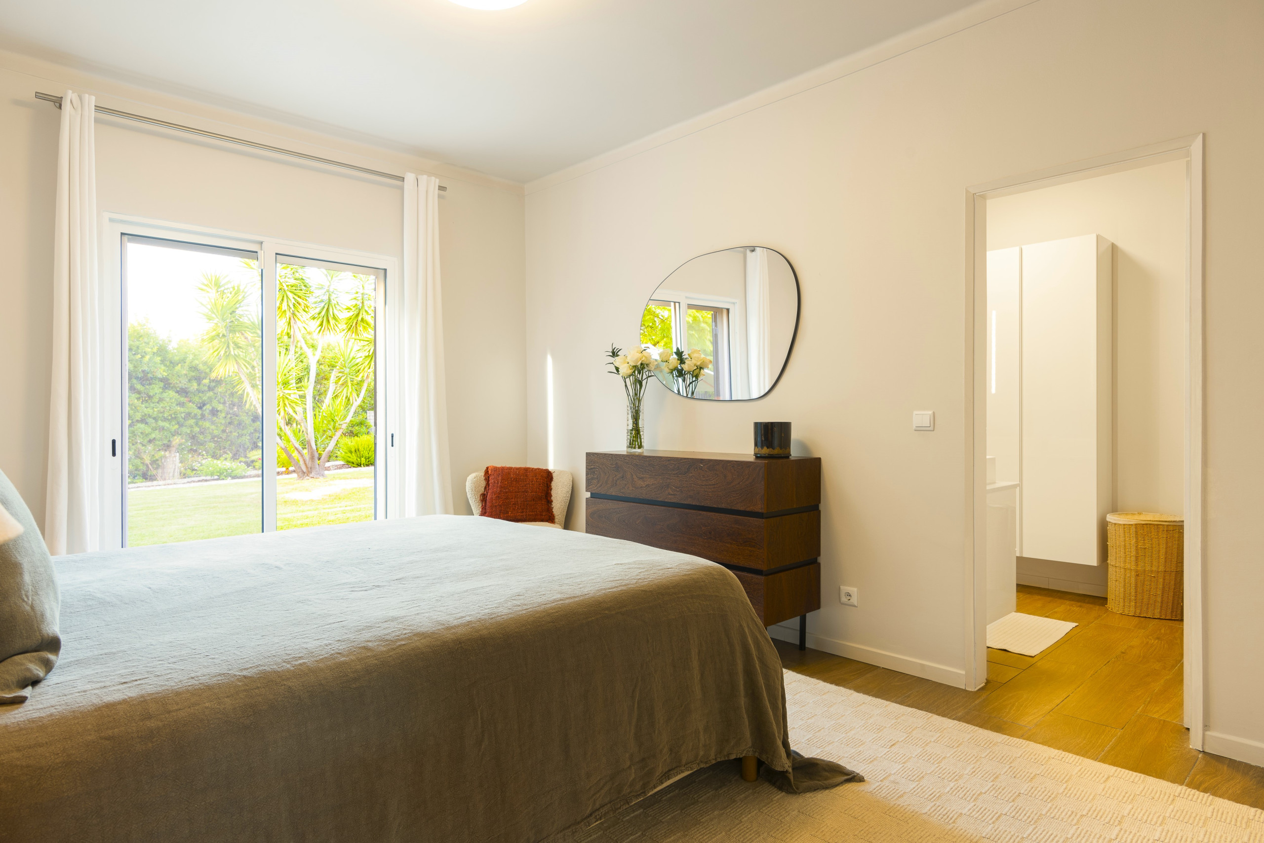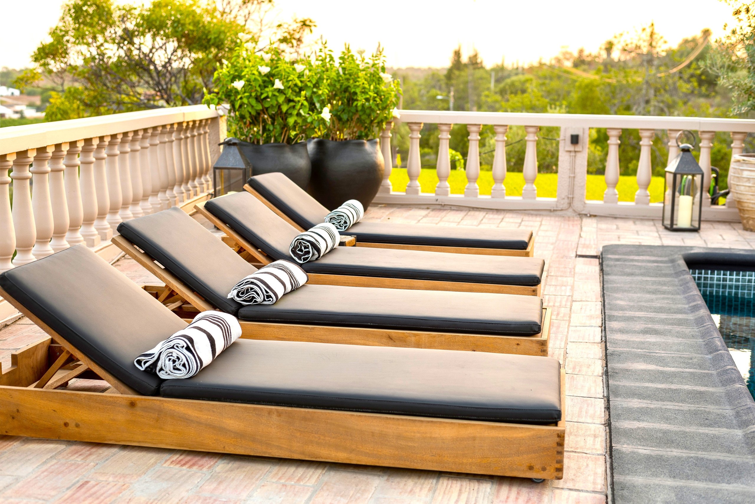 El patio exterior incluye una mesa de comedor para ocho personas, dos grandes sofás que se enfrentan para relajarse y contemplar la hermosa piscina y las vistas al mar. Área de bar con nevera exterior donde puede servir comida o bebidas junto a la mesa de comedor. Piscina gigante de agua salada climatizada de 10 m x 5 m, seis tumbonas con sombrillas para protección solar, incluida una ducha exterior. Parrilla de gas Weber y una parrilla tradicional portuguesa de carbón incluidas. La casa también incluye un mirador al que se sube por un tramo completo de escaleras con una cama hamaca para dos personas, desde donde puede mirar al mar, leer un libro o simplemente tomar una merecida siesta. El jardín trasero, con acceso desde cada dormitorio, incluye una sombrilla con zona de asientos y amplios espacios para dar un paseo por el jardín natural o leer un libro.