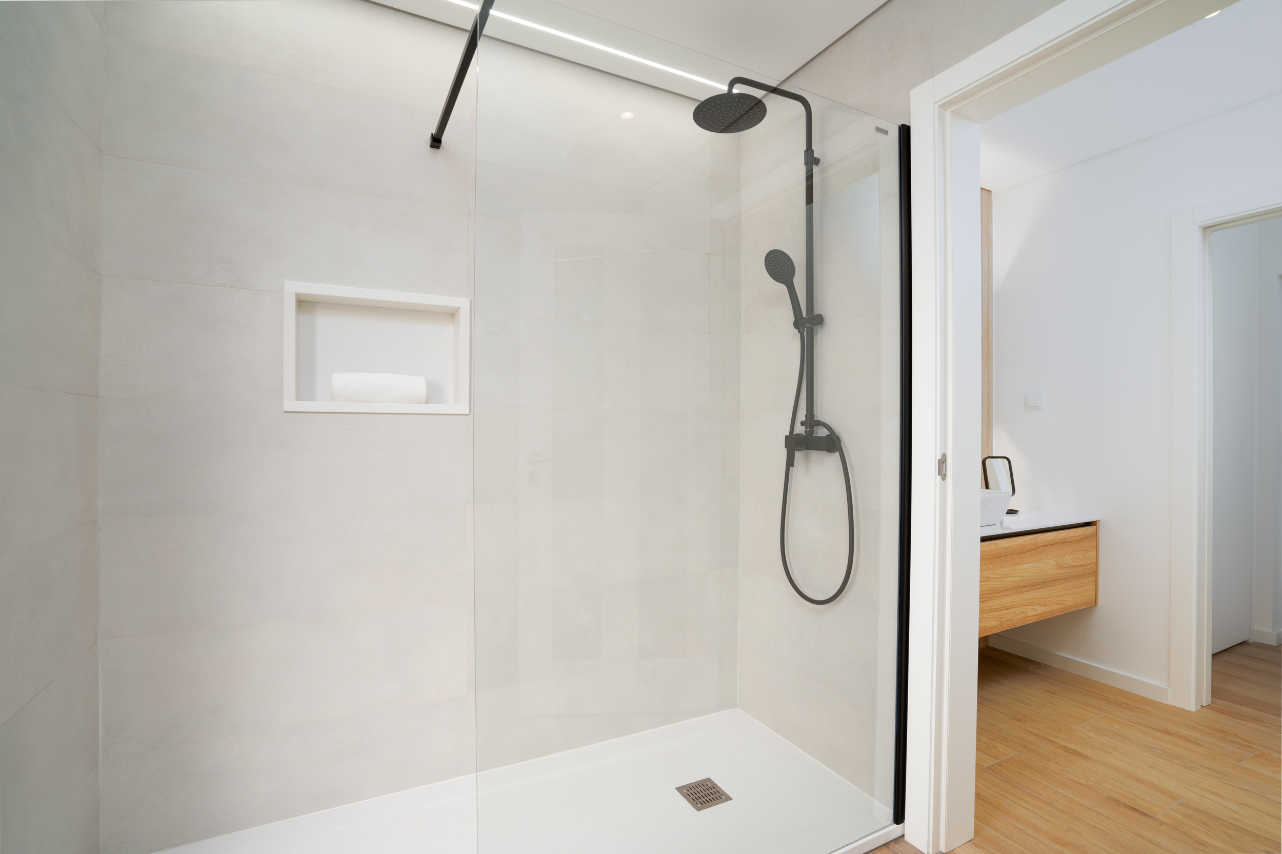 À l'arrière de l'appartement, les chambres comprennent une confortable chambre principale avec un lit king size et une salle de bain attenante, avec baignoire et douche suspendue. La deuxième chambre comprend 2 lits simples et dispose d'une salle de douche séparée. Tous deux sont équipés d'armoires et de climatisation.