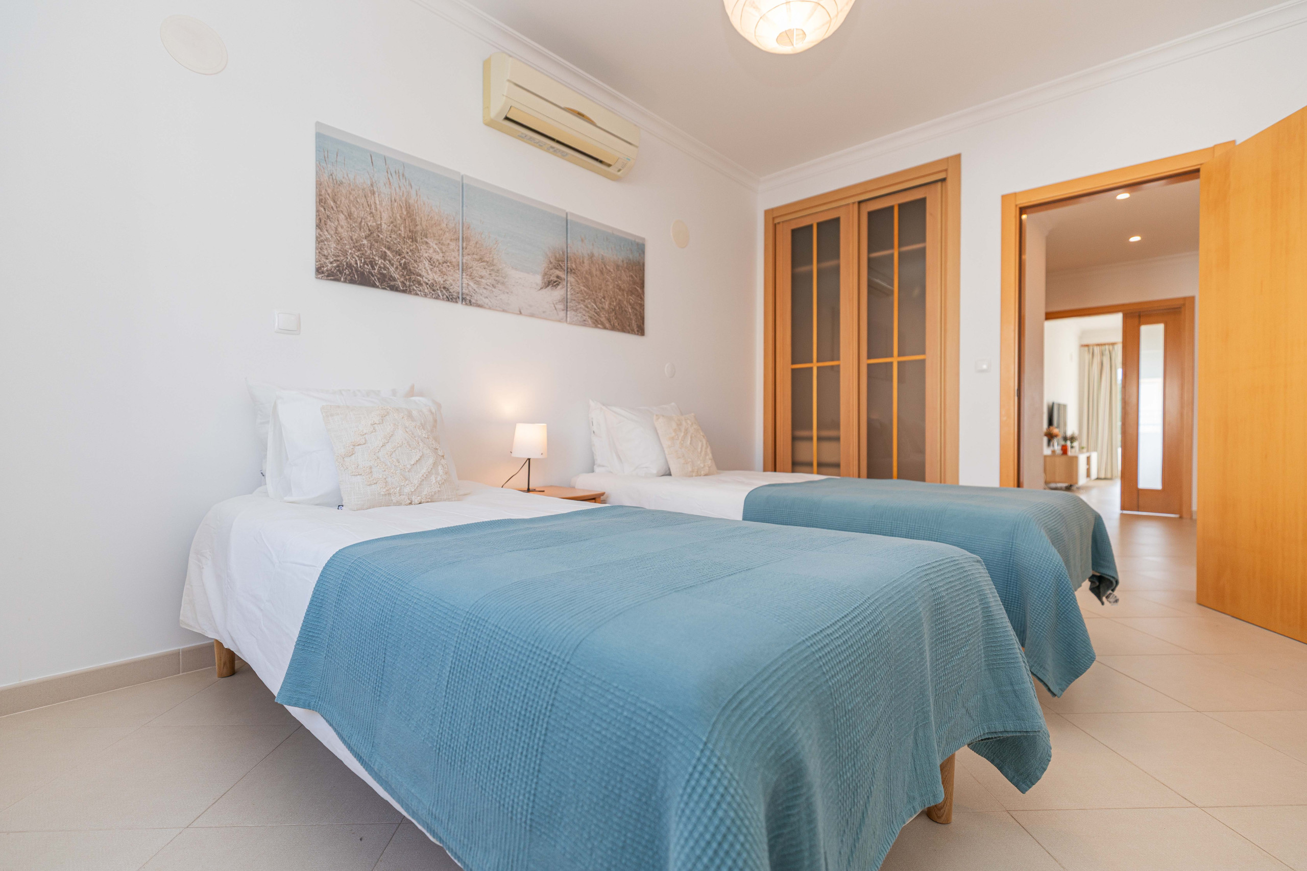 À l'arrière de l'appartement, vous trouverez une chambre spacieuse, avec un lit king-size douillet, des armoires intégrées pour vos essentiels de vacances, et une climatisation rafraîchissante pour vous garder au frais pendant les journées ensoleillées de l'Algarve. Juste à côté, la salle de bain propose une baignoire complète avec une douche suspendue - idéale pour un bain apaisant ou un rafraîchissement rapide après une journée à la plage.