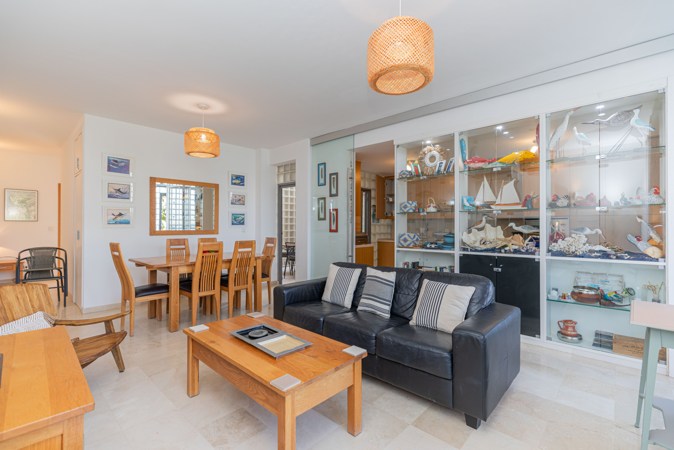 L'intérieur chaleureux offre aux visiteurs un séjour confortable. Avec une disposition sur un seul niveau, le logement s'écoule facilement d'avant en arrière. À l'entrée, vous êtes accueilli dans le salon-salle à manger, avec des sièges confortables et des meubles en chêne clair assortis, comprenant une table à manger rectangulaire et des chaises. Une cloison en verre attrayante sépare le salon de la cuisine, où un large éventail d'ustensiles et d'appareils garantit que la cuisine à domicile est simple et agréable. Nichée joliment à l'arrière de la cuisine, une porte mène à un atrium interne privé avec une table et des chaises, parfait pour les petits-déjeuners frais ou les dîners du soir au chaud. L'appartement dispose de deux chambres : une chambre principale double avec une salle de douche privée, et une chambre adjacente avec deux lits et une salle de bain partagée comprenant une baignoire et une douche suspendue.