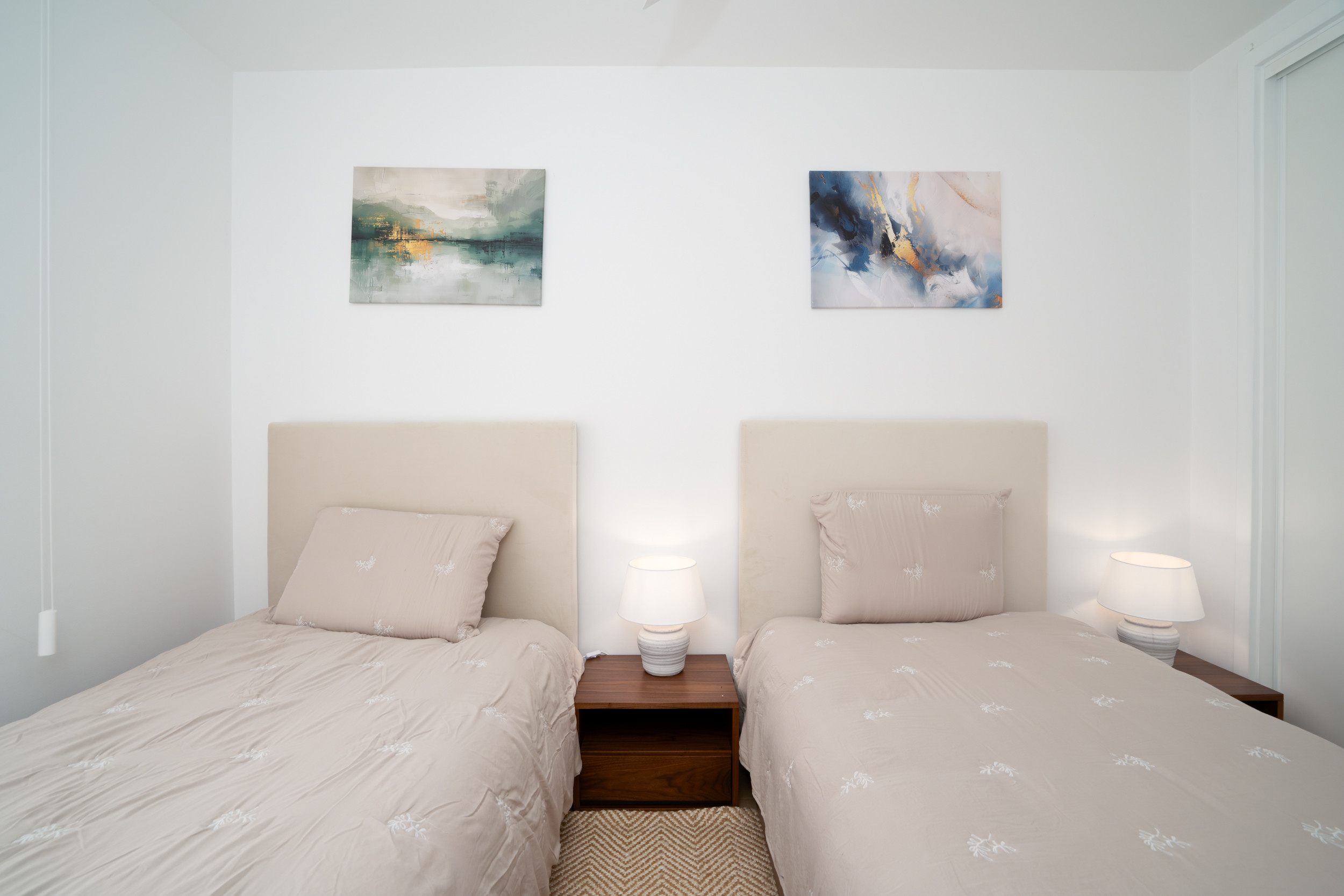 La chambre principale dispose d'un lit king-size, de placards intégrés, de la climatisation, d'un ventilateur de plafond et d'une salle de douche privative. La deuxième chambre propose deux lits jumeaux, de nombreux espaces de rangement, sa propre climatisation et un ventilateur de plafond, avec accès à une salle de bain séparée — idéal pour accueillir des amis ou de la famille.