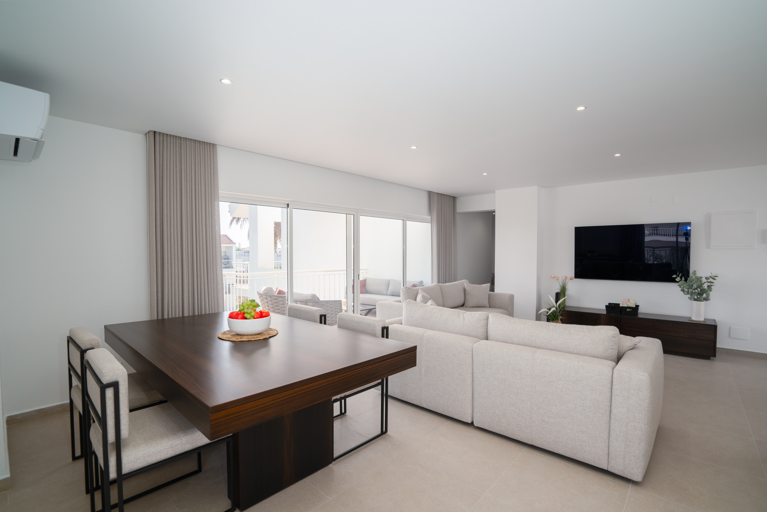 Entrez dans un espace de vie lumineux et spacieux avec un coin salon confortable, la climatisation et une Smart TV — l'endroit idéal pour se détendre après une journée sous le soleil de l'Algarve. La table à manger en bois élégante crée un espace convivial pour des repas partagés, tandis que la cuisine moderne et entièrement équipée comprend un lave-vaisselle, un lave-linge et tous les appareils essentiels pour un mode de vie sans effort.