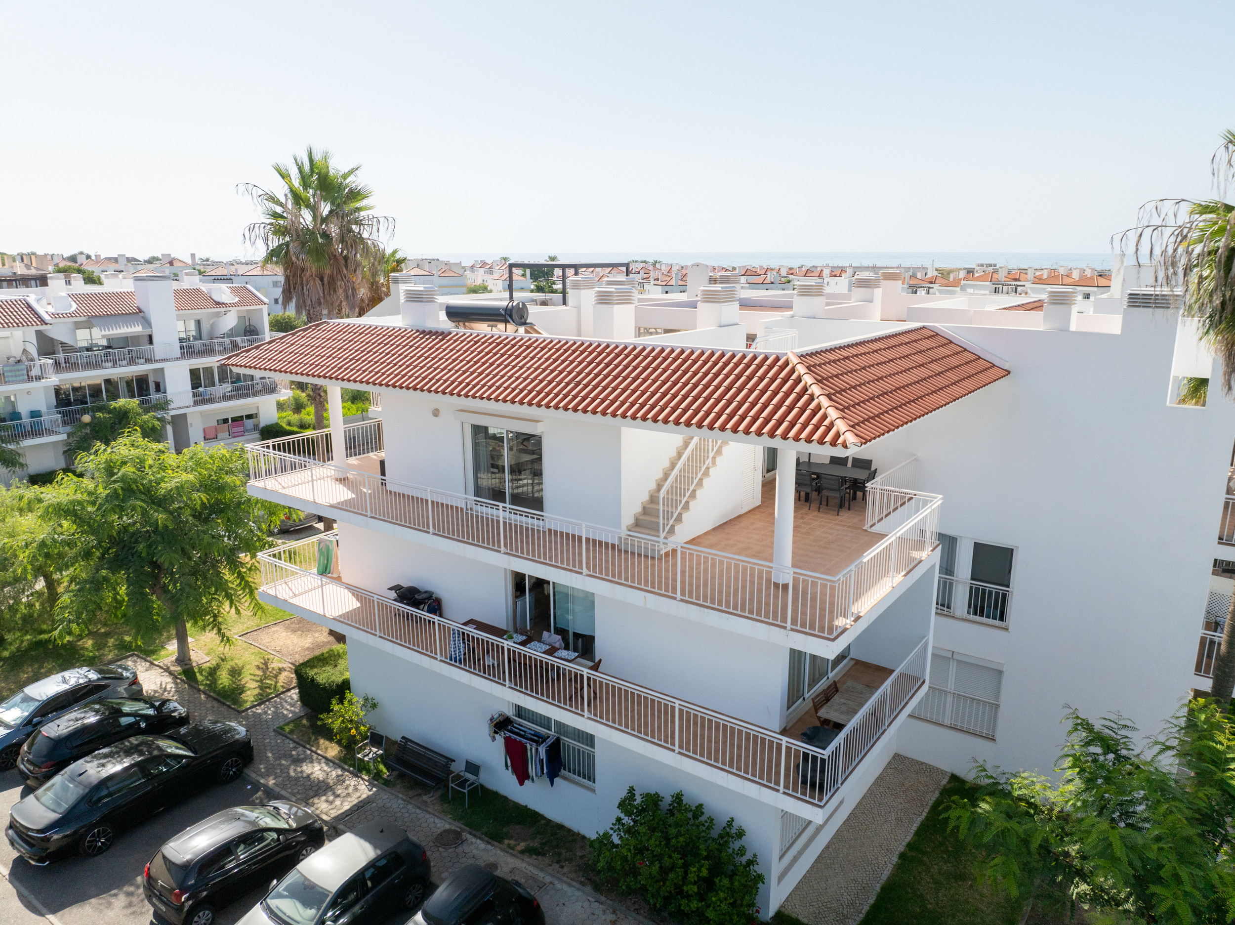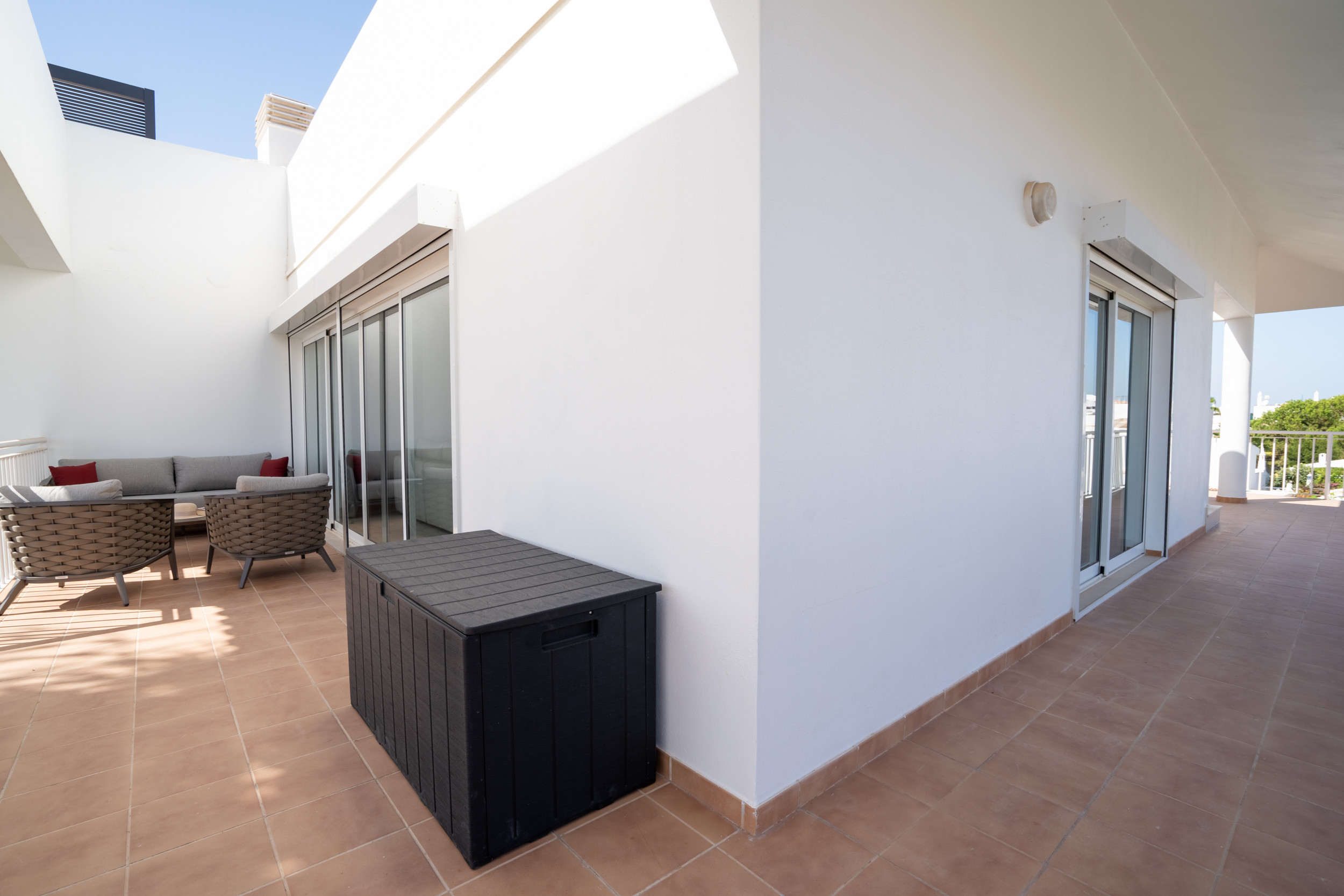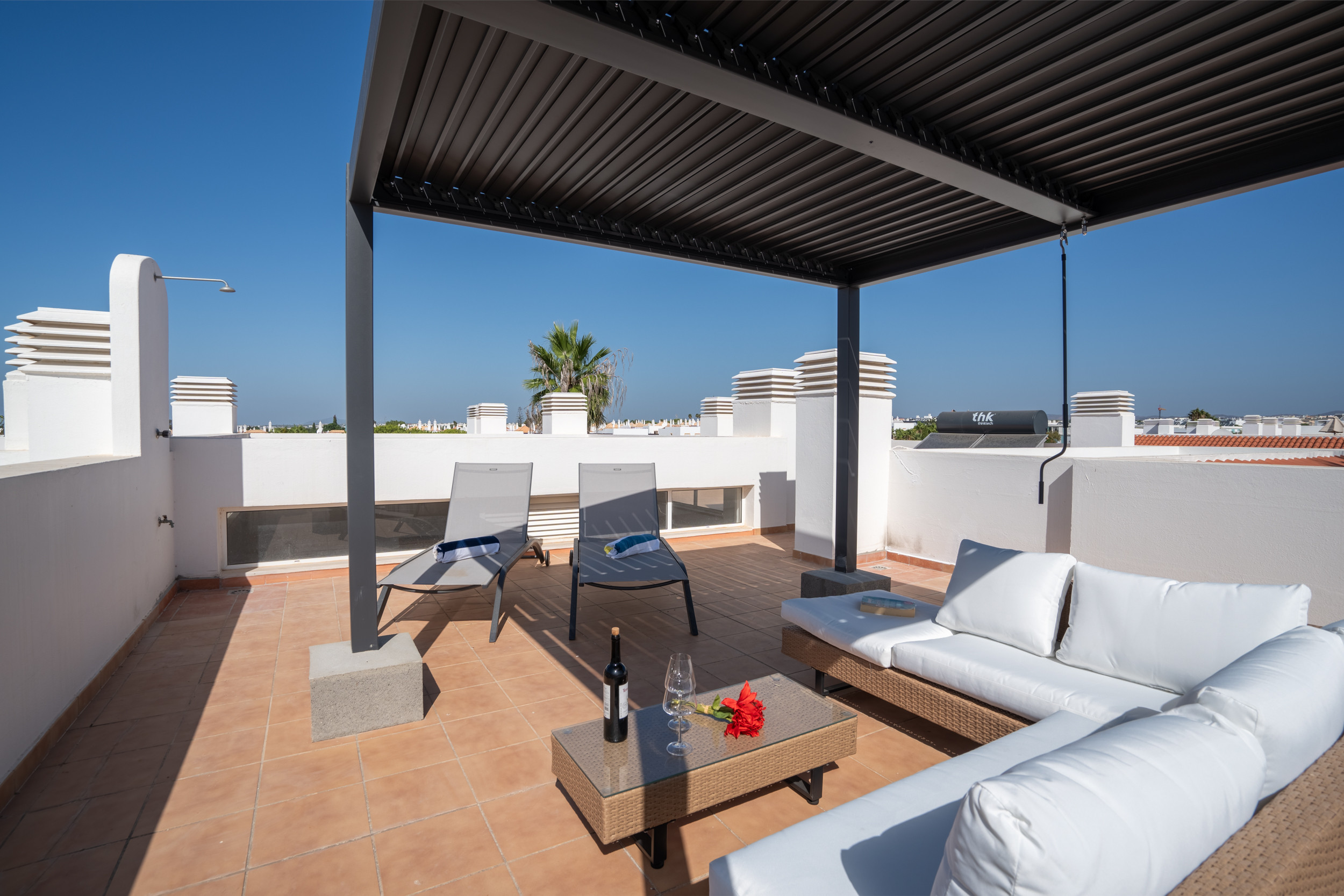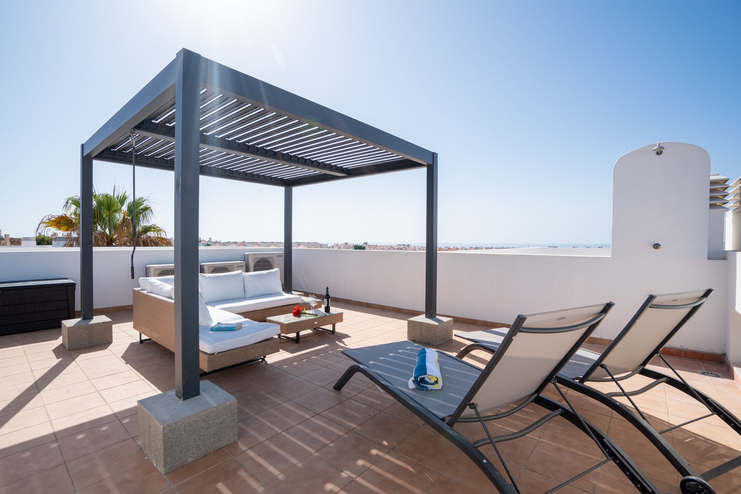 Deux balcons privés s'enroulent autour de l'appartement, offrant plusieurs endroits pour se détendre ou dîner en plein air. Profitez de votre café du matin ou d'un verre de vin le soir tout en savourant la douce brise côtière. La magnifique terrasse privée sur le toit offre l'évasion parfaite — avec des transats, une pergola ombragée et des sièges confortables pour lire ou se livrer à une réflexion tranquille.