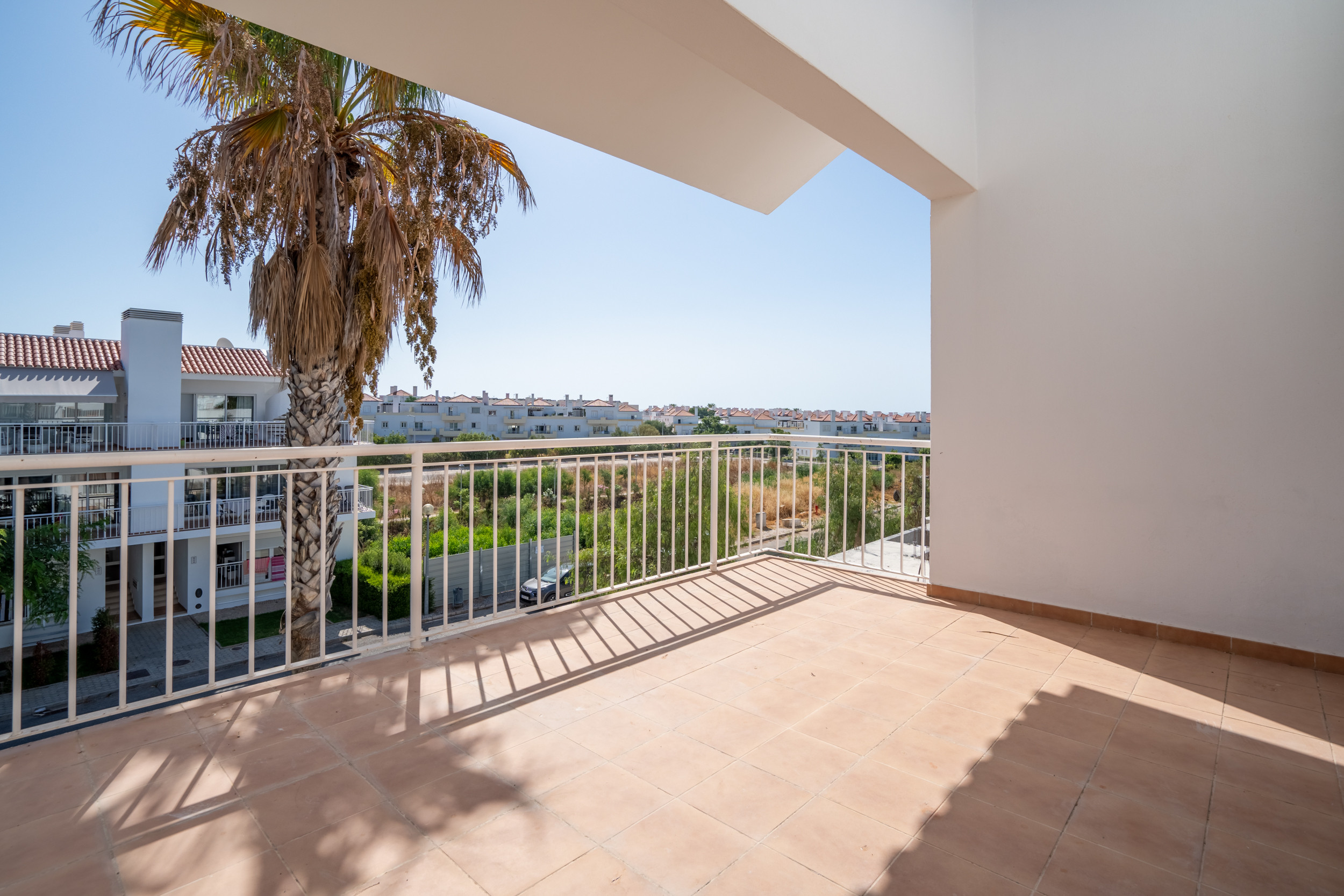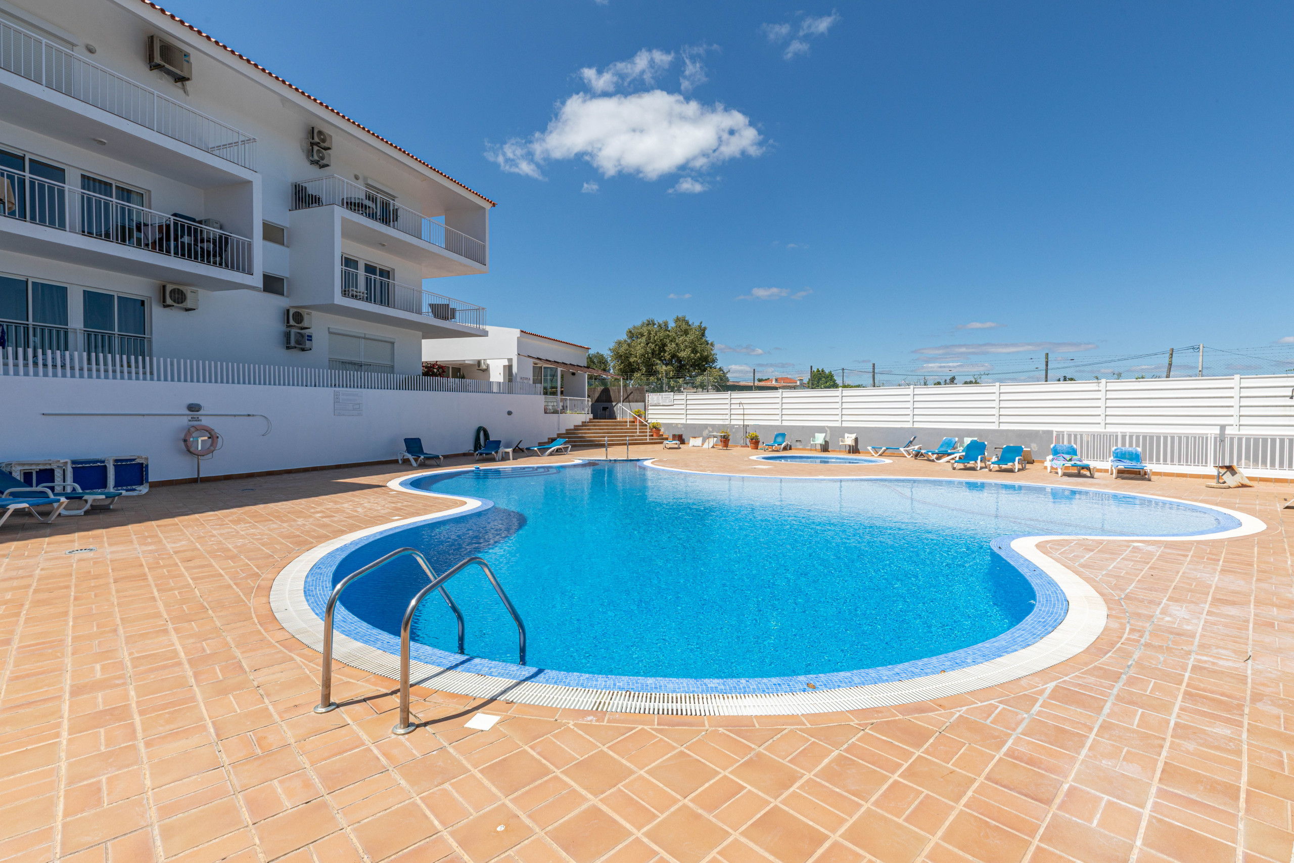 À l'arrière de l'appartement, vous trouverez une chambre spacieuse, avec un lit king-size confortable, des armoires intégrées pour vos essentiels de vacances, et une climatisation rafraîchissante pour vous garder au frais pendant les journées ensoleillées de l'Algarve. Juste à côté, la salle de bain propose une baignoire complète avec une douche suspendue—idéale pour un bain apaisant ou un rafraîchissement rapide après une journée à la plage.