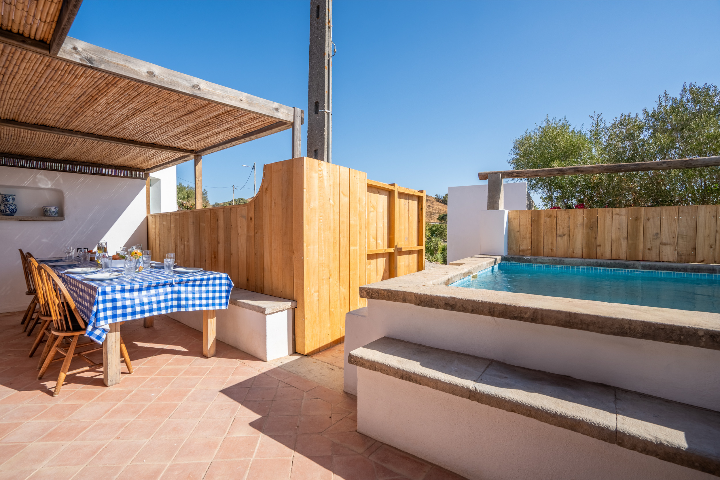 À l'extérieur, une terrasse de restauration ombragée est parfaite pour des petits-déjeuners ensoleillés, des déjeuners tranquilles ou des dîners romantiques en plein air, tandis que la piscine privée, nichée derrière un mur rustique, offre une intimité totale et un endroit rafraîchissant pour se détendre. La propriété est de plain-pied, sans escaliers, garantissant un accès facile partout.