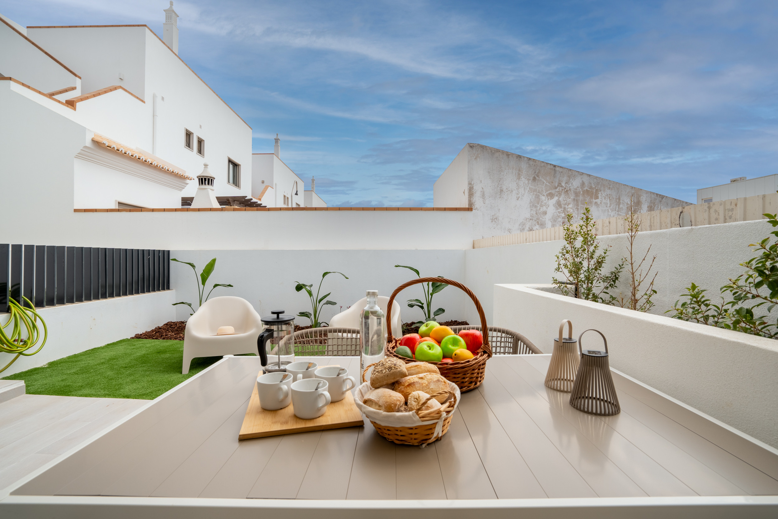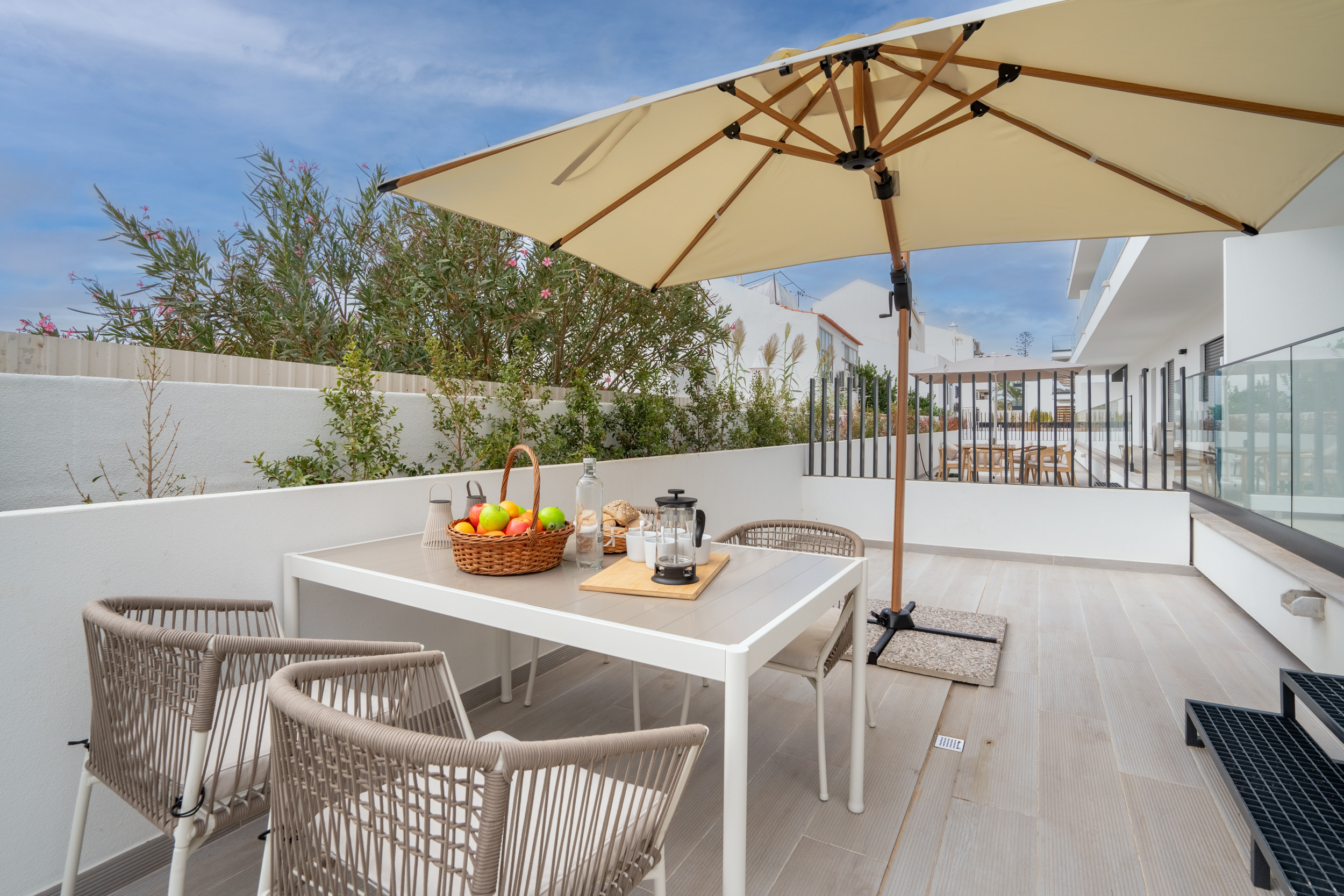 Saia para desfrutar da sua própria área exterior privada. O pequeno jardim e o terraço incluem espreguiçadeiras, uma mesa de refeições e assentos confortáveis - perfeitos para refeições ao ar livre, almoços prolongados ou simplesmente para apanhar sol.