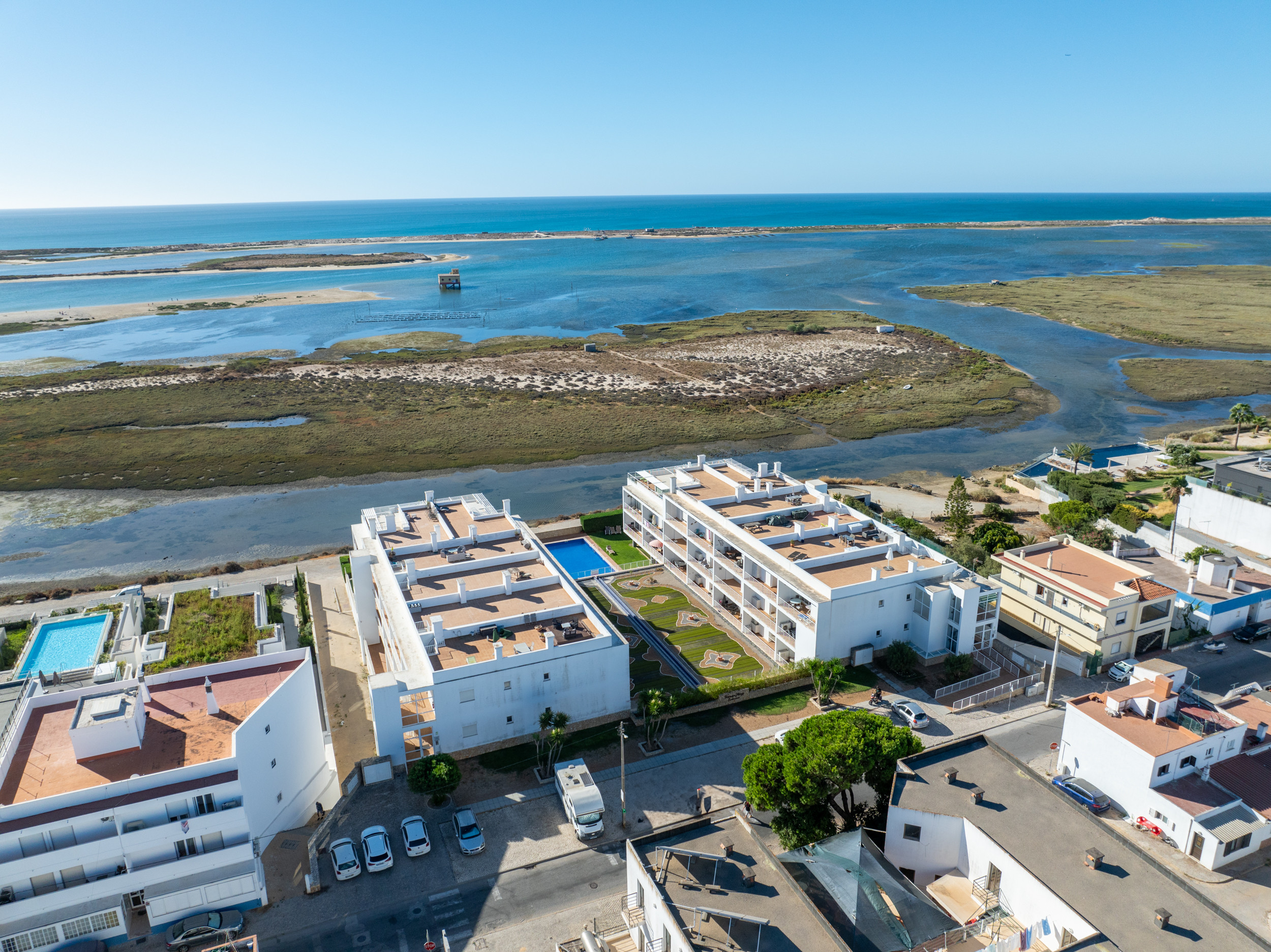 Desfrute de uma magnífica varanda envolvente com vista para a piscina, a Ria Formosa e o Oceano Atlântico. Duas esplanadas oferecem opções: relaxe diretamente fora da sala de estar com espreguiçadeiras, mesa de jantar e cadeiras - perfeito para refeições ao ar livre a qualquer hora do dia - ou suba a escada em caracol até o deck superior para tomar banhos de sol e desfrutar das vistas mais deslumbrantes. Os hóspedes têm acesso a uma piscina exclusiva para residentes, completa com espreguiçadeiras. Quer esteja a desfrutar de uma refrescante nadada matinal ou a descansar após um dia na praia, é um local encantador para relaxar e refrescar-se.