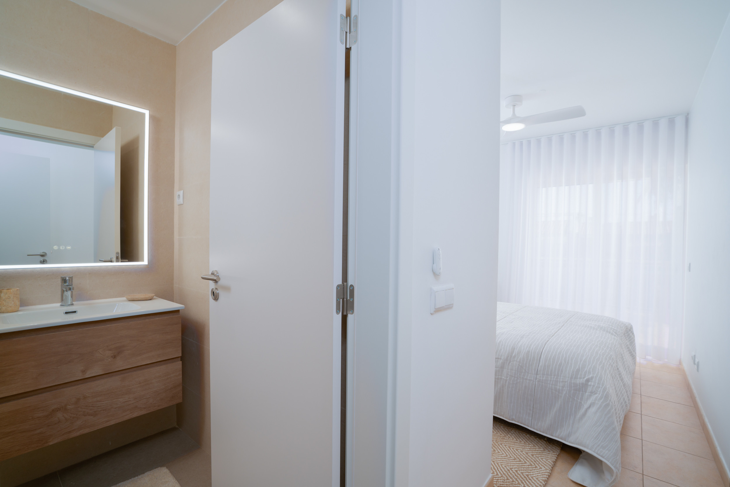 Nos fundos do apartamento, você encontrará um quarto espaçoso, com uma cama king-size confortável, guarda-roupas embutidos para seus itens essenciais de férias, e ar-condicionado refrescante para mantê-lo fresco nos dias ensolarados do Algarve. Logo ao lado, o banheiro oferece uma banheira completa com chuveiro suspenso - ideal para um banho relaxante ou uma rápida refrescada após um dia na praia.