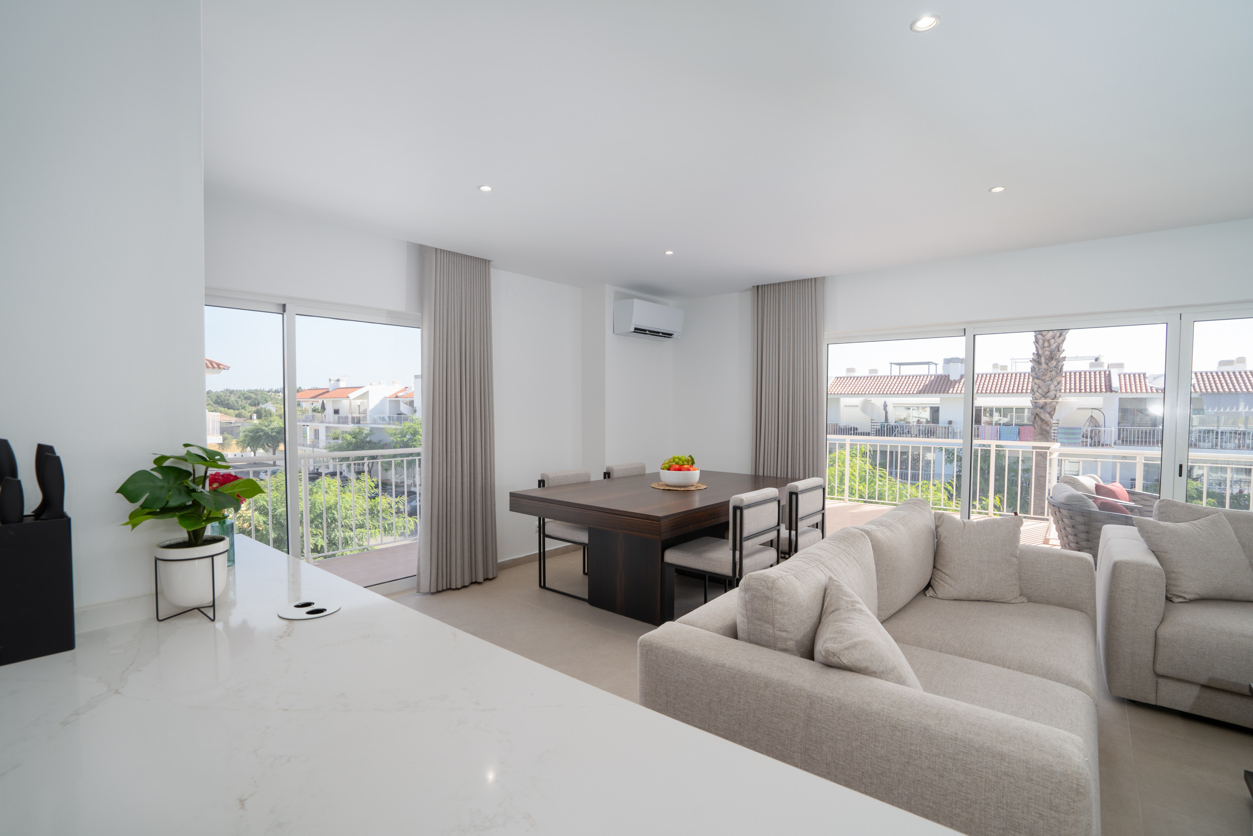 Entre numa área de estar luminosa e espaçosa com assentos confortáveis, ar condicionado e uma Smart TV — o local perfeito para relaxar após um dia de sol no Algarve. A elegante mesa de jantar em madeira cria um espaço acolhedor para refeições partilhadas, enquanto a cozinha moderna e totalmente equipada inclui máquina de lavar louça, máquina de lavar roupa e todos os eletrodomésticos essenciais para uma vida sem esforço.