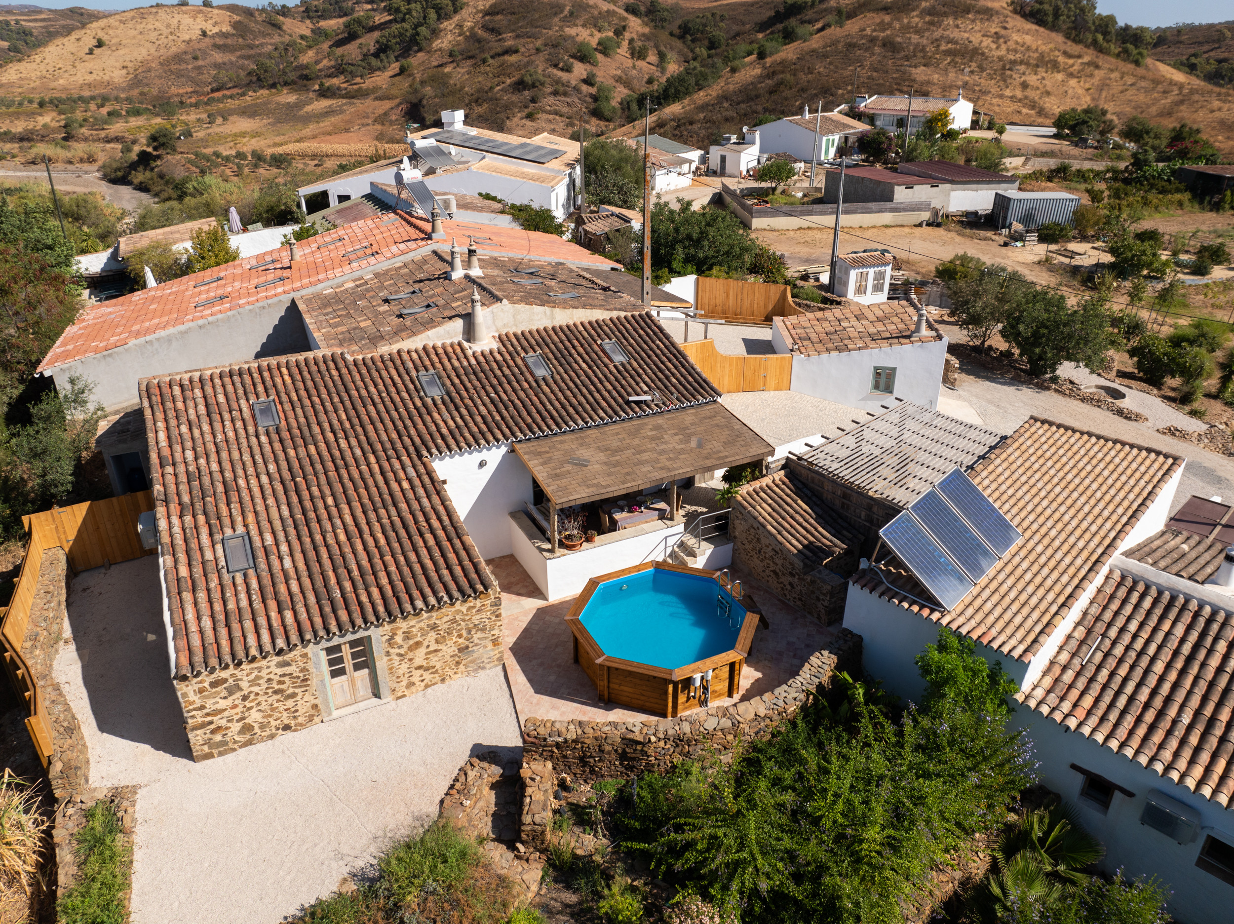 Lá fora, um grande terraço com uma mesa de jantar de madeira, bancos e uma piscina de mergulho acima do solo proporciona o cenário perfeito para pequenos-almoços ensolarados, almoços relaxantes ou jantares ao ar livre. A propriedade principal está toda num único piso, com fácil acesso em toda a área, e o anexo é alcançado através de um caminho de pedra que tem vários degraus pequenos.