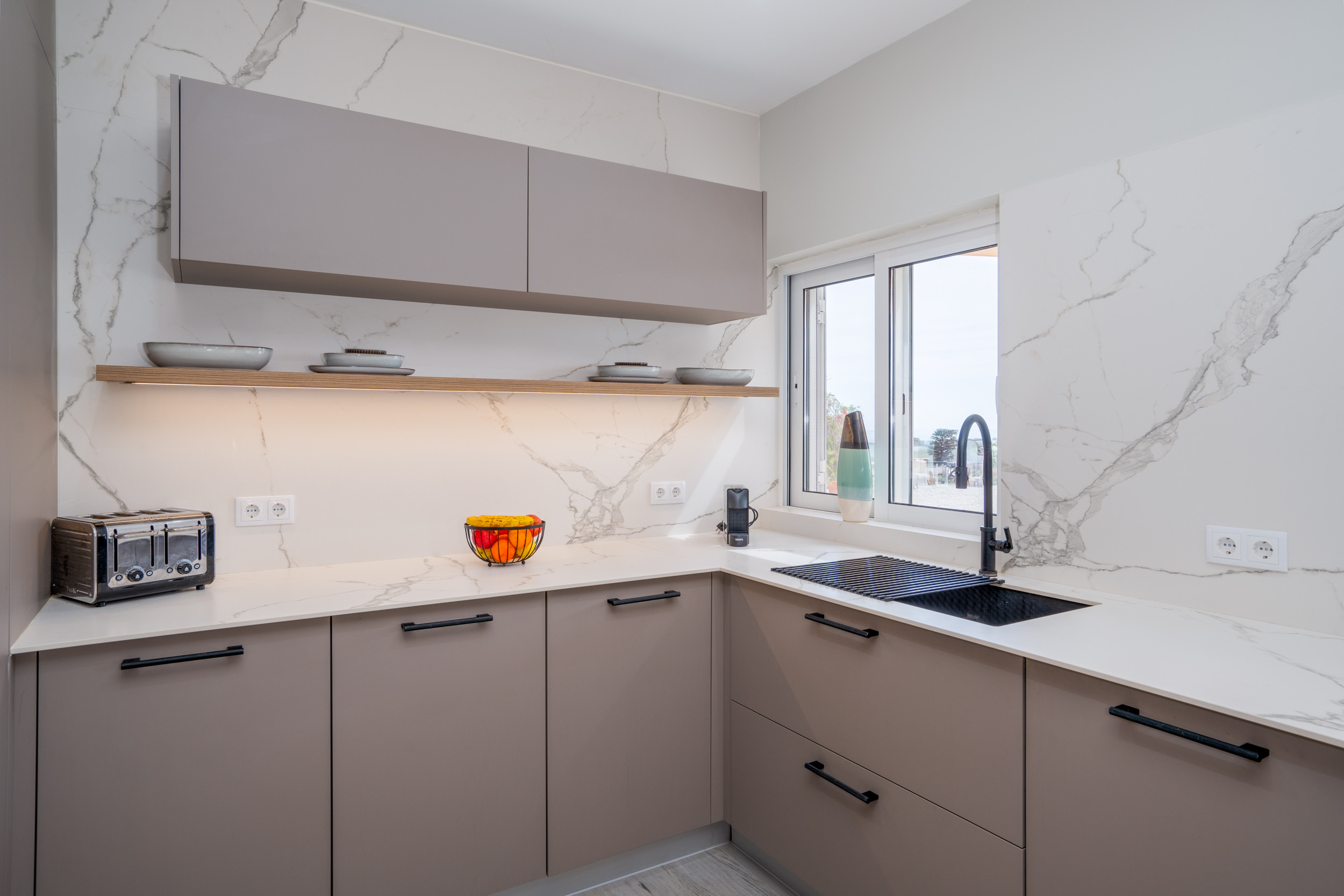 A kitchenette, de inducção, está equipada com frigorífico, forno, congelador, máquina de lavar louça, louça/talheres, utensílios/cozinha, máquina de café, torradeira, jarro eléctrico e máquina de sumos.