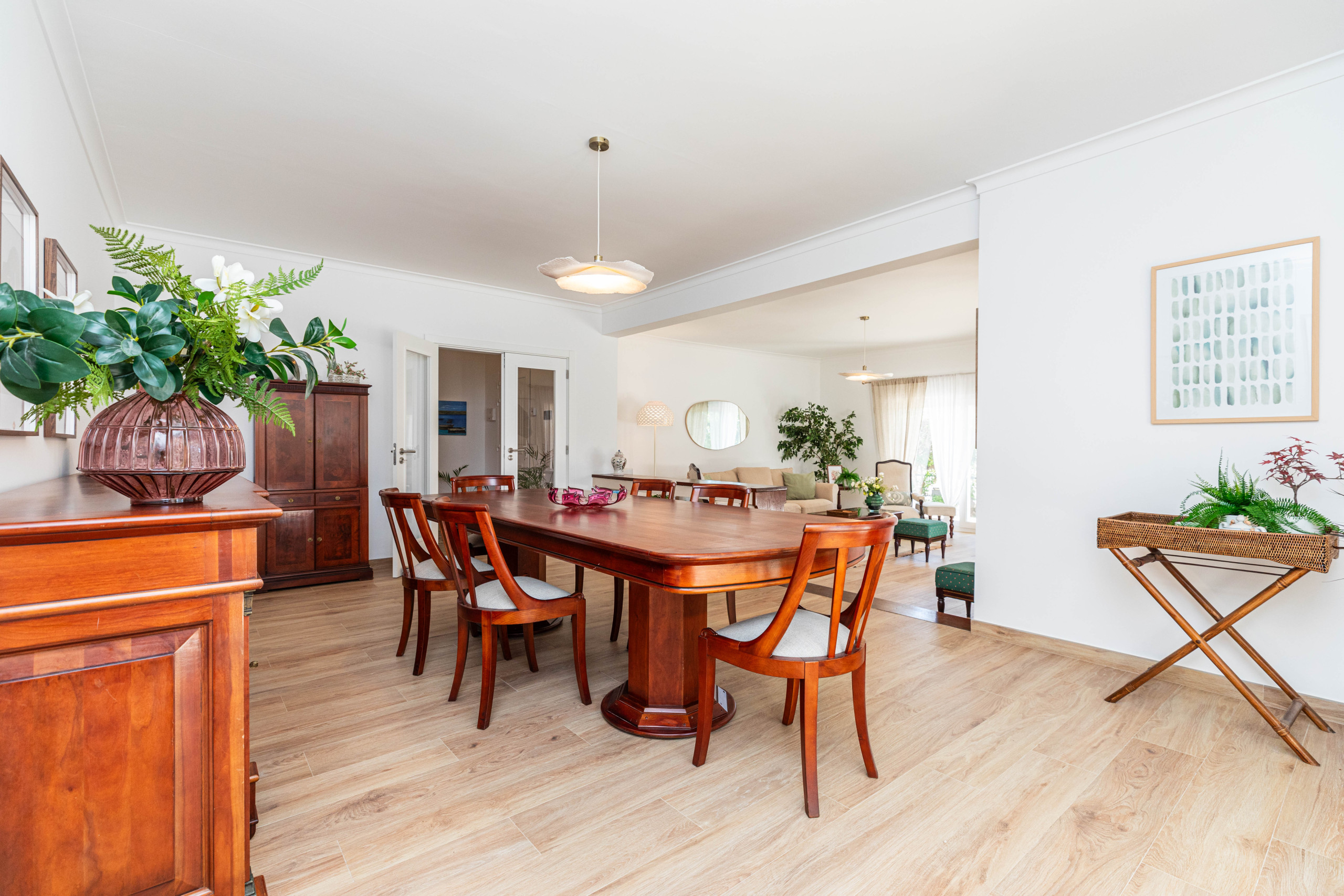 É recebido por um impressionante hall de entrada, com áreas de estar à esquerda e um quarto à direita. A espaçosa sala de estar em planta aberta apresenta uma TV e grandes janelas de pátio com vista para a piscina. A área de jantar elevada inclui uma mesa e cadeiras elegantes, e todo o espaço está ricamente mobilado. A cozinha luminosa na parte de trás oferece amplo armazenamento, eletrodomésticos completos e uma mesa de pequeno-almoço. Uma porta traseira abre para os jardins. À direita, existe um quarto conveniente no rés-do-chão com uma área de vestir e casa de banho privativa.