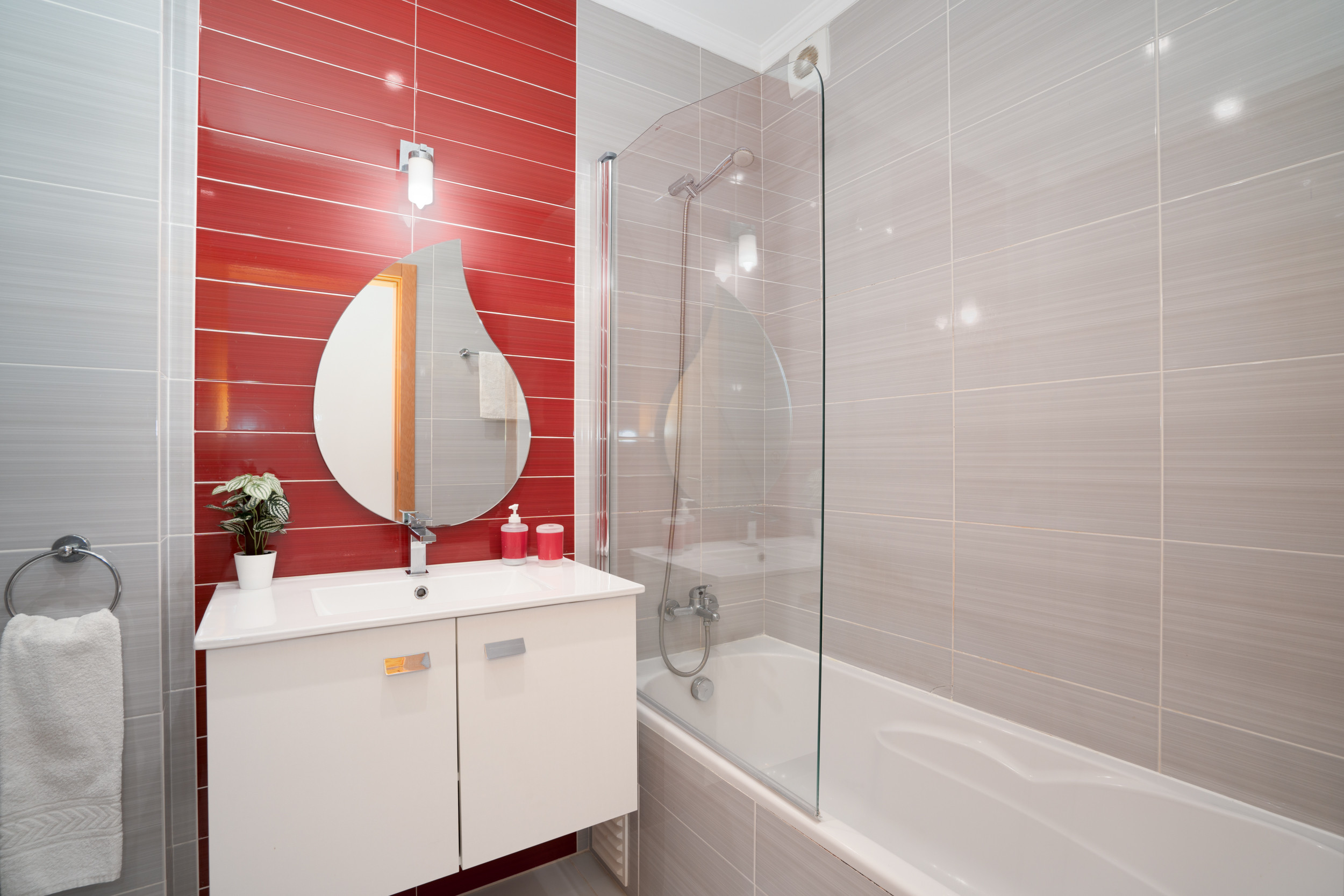 Step into a bright, airy open-plan space from the entrance, featuring a wide dining area with a wooden table, comfy sofas, wall-mounted TV, and Wi-Fi. The fully equipped galley kitchen makes meal prep a breeze. The apartment has 2 bedrooms: a king-size bedroom with en-suite bathroom and a twin room with a separate bathroom. Fitted wardrobes and air-conditioning throughout ensure comfort.