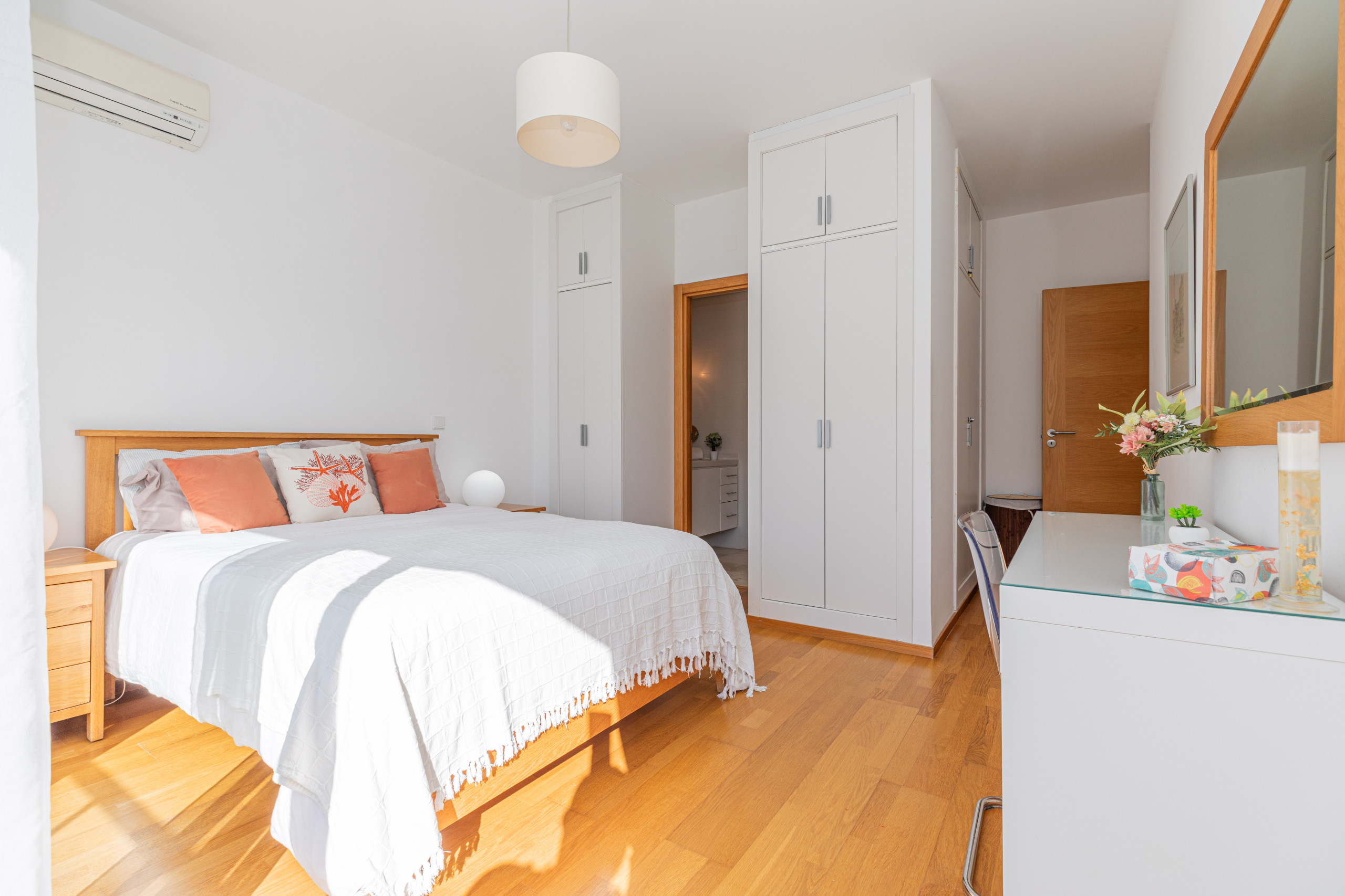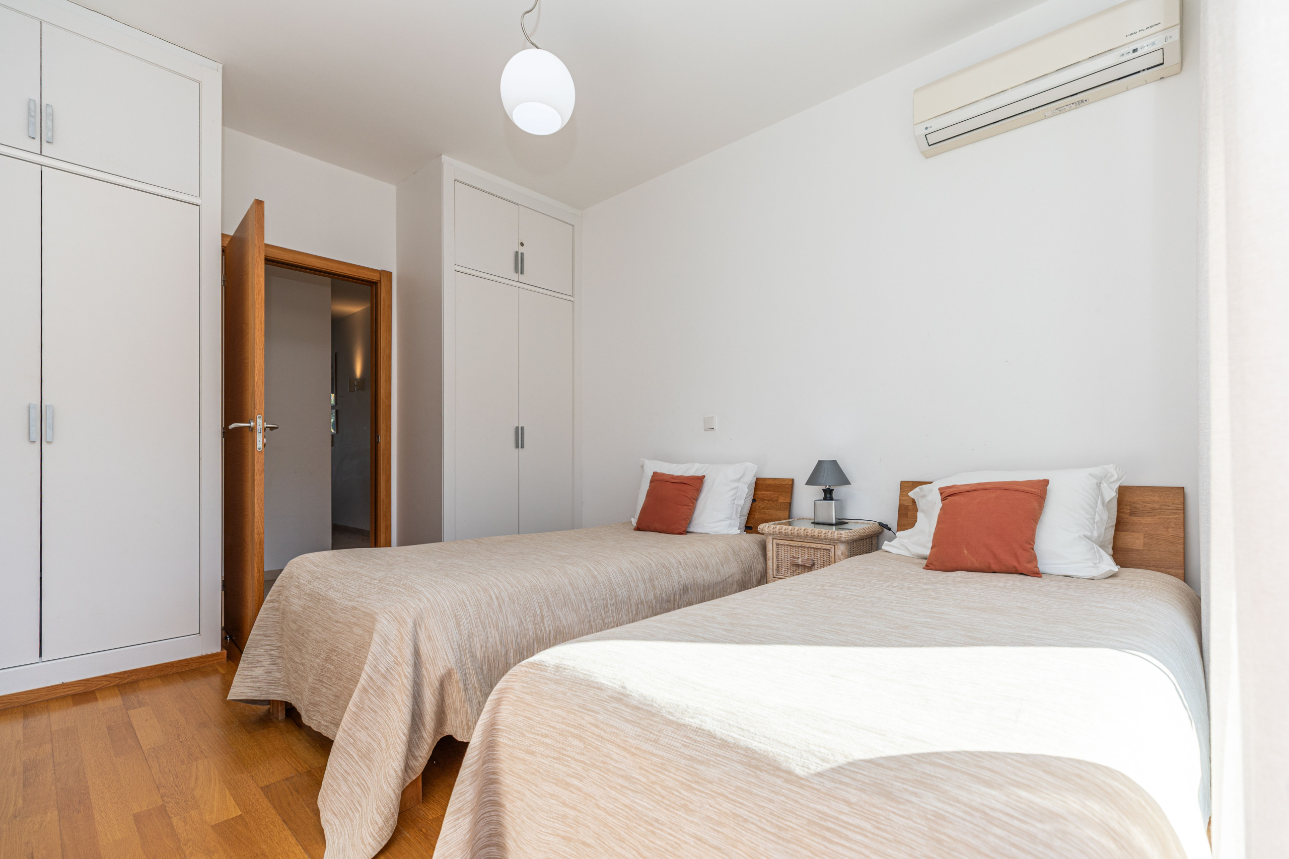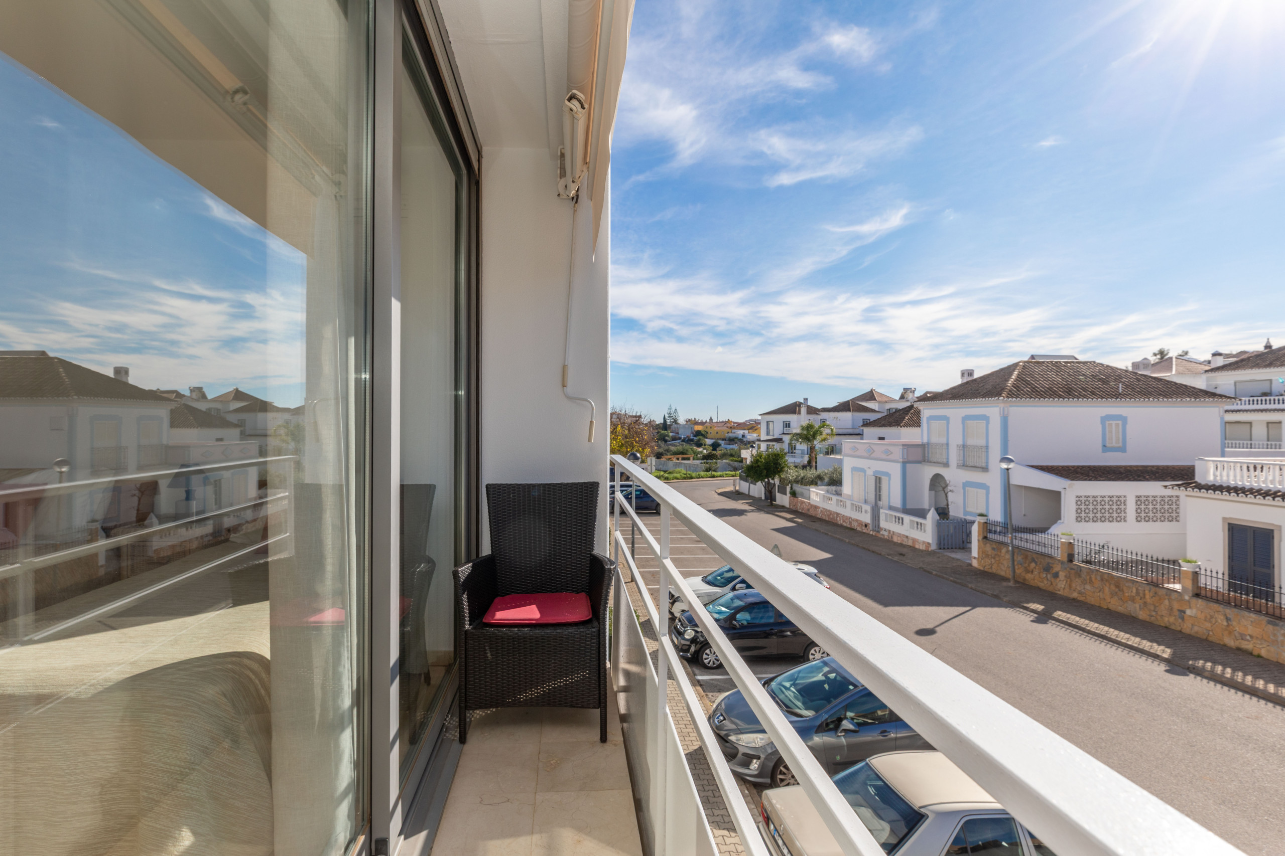 At the rear of the apartment, you’ll find a spacious bedroom, featuring a plush king-size bed, fitted wardrobes for your holiday essentials, and refreshing air conditioning to keep you cool on sunny Algarve days. Just next door, the bathroom offers a full bathtub with an overhead shower—ideal for a soothing soak or a quick refresh after a beach day.