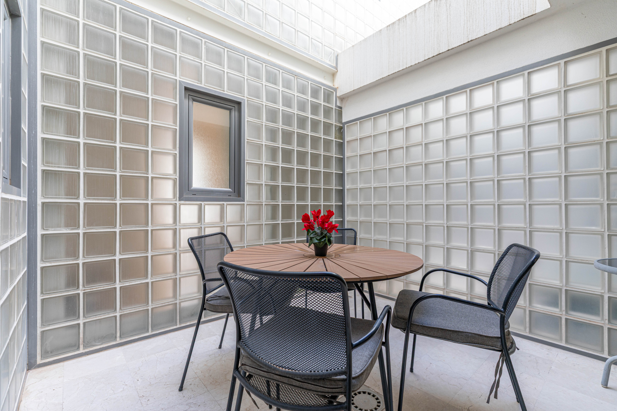 The cosy interior offers visitors a comfortable stay. With a single-level layout, the accommodation flows easily from front to back. From the entrance, you are welcomed into the lounge-diner, featuring comfy seating and matching light oak furnishings, including a rectangular dining table and chairs. An attractive glass-shelved partition separates the lounge from the kitchen, where a large range of utensils and appliances ensures that home catering is simple and enjoyable. Tucked neatly at the back of the kitchen, a door leads to a private internal atrium with a table and chairs, perfect for cool breakfasts or warm evening dining. The apartment has two bedrooms: a master double room with a private shower room, and an adjoining twin bedroom with a shared bathroom featuring a bathtub and overhead shower.