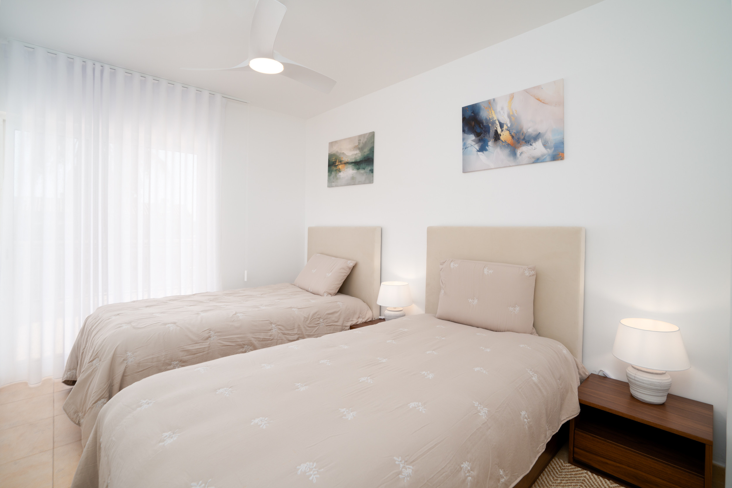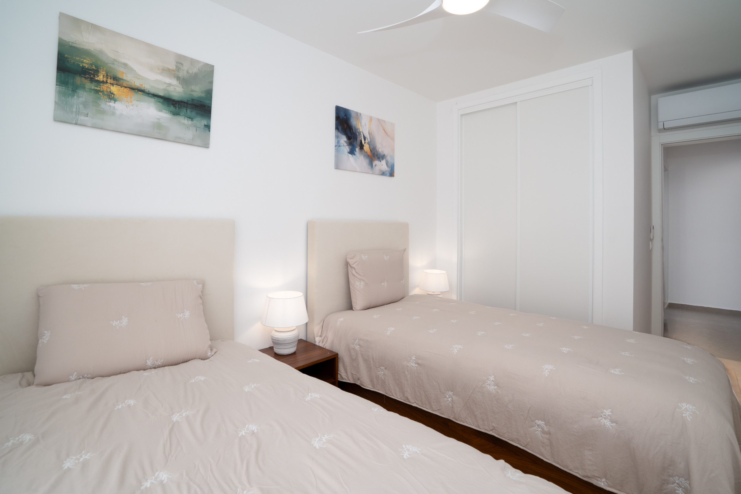 The main bedroom features a king-size bed, built-in wardrobes, air conditioning, ceiling fan, and a private en-suite shower room. The second bedroom offers twin beds, ample storage, and its own air conditioning and ceiling fan, with access to a separate bathroom — ideal for visiting friends or family.
