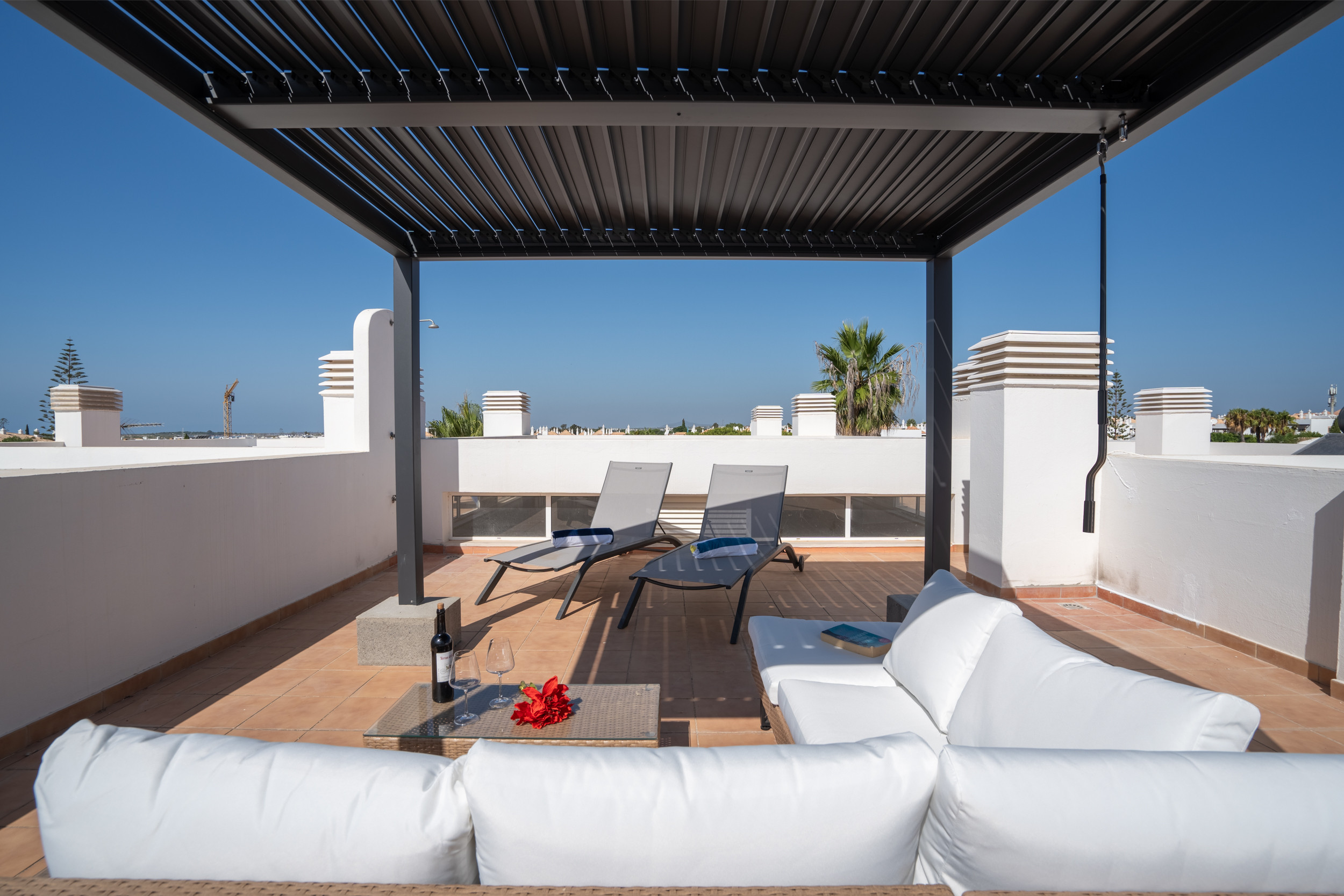 Two private balconies wrap around the apartment, offering multiple spots to relax or dine al fresco. Enjoy morning coffee or an evening glass of wine while soaking up the warm coastal breeze. The stunning private roof terrace provides the perfect escape — complete with sun loungers, a shaded pergola, and comfortable seating for reading or quiet reflection.