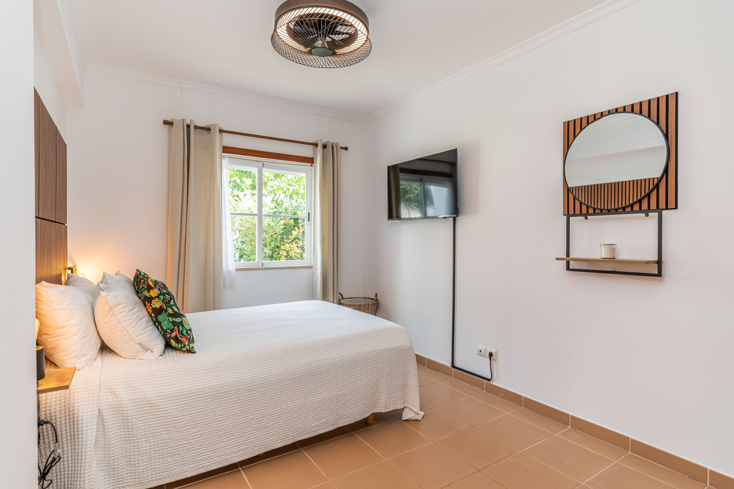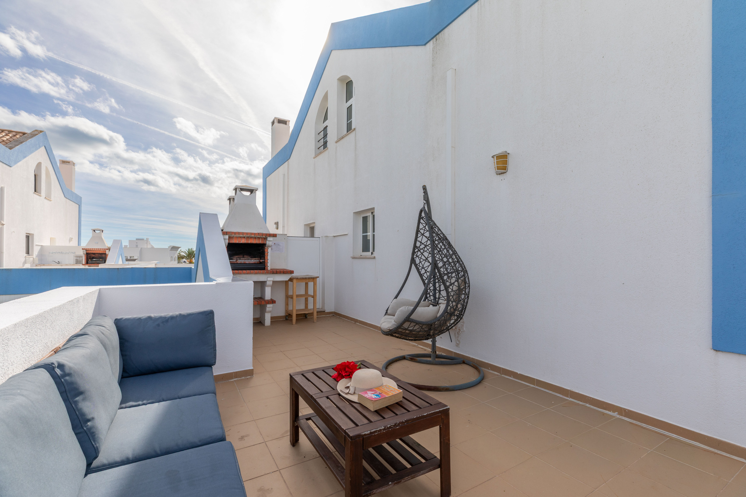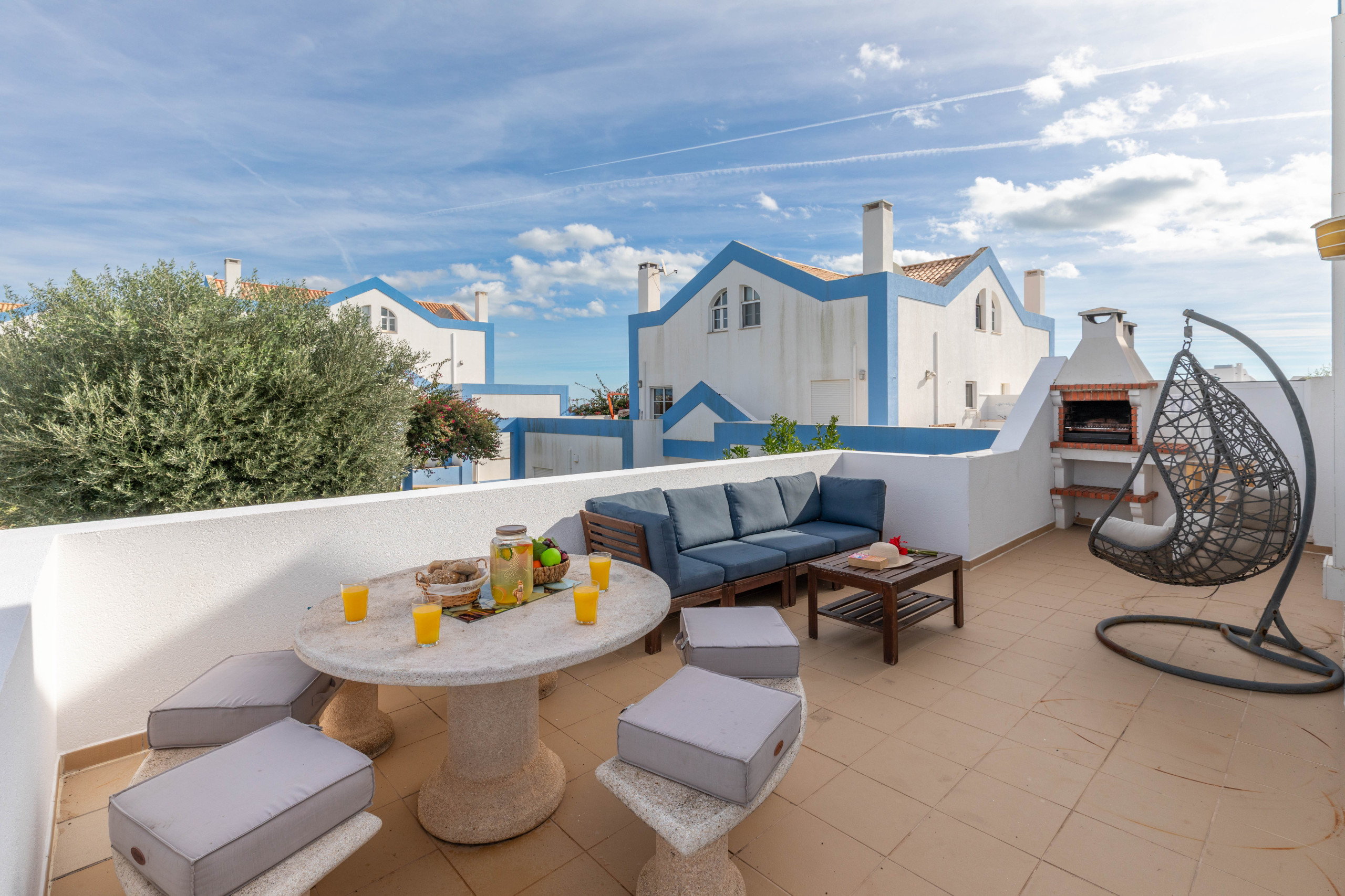 The townhouse features a lovely first-floor private terrace, accessed directly from the king-size bedroom. This sunny space is perfect for relaxing with a drink, enjoying a light meal at the dining table, or unwinding on the sunbeds while taking in panoramic views of the sparkling pool below and the picturesque town of Tavira. A traditional BBQ adds the perfect touch for al fresco dining and family gatherings.