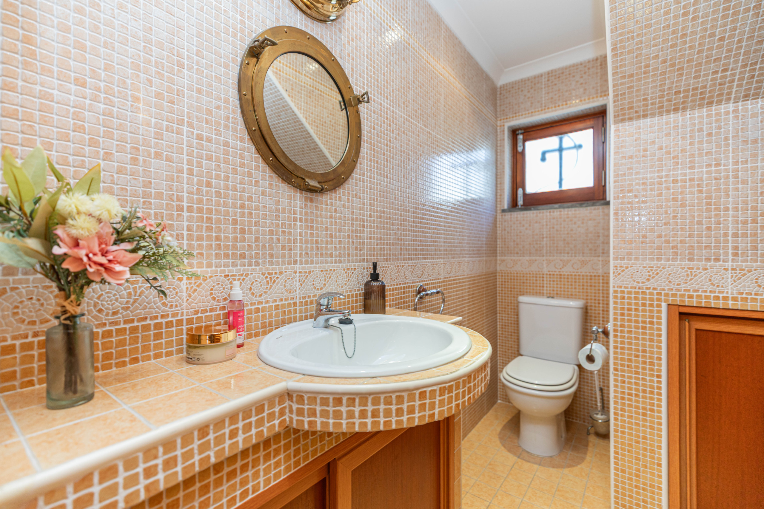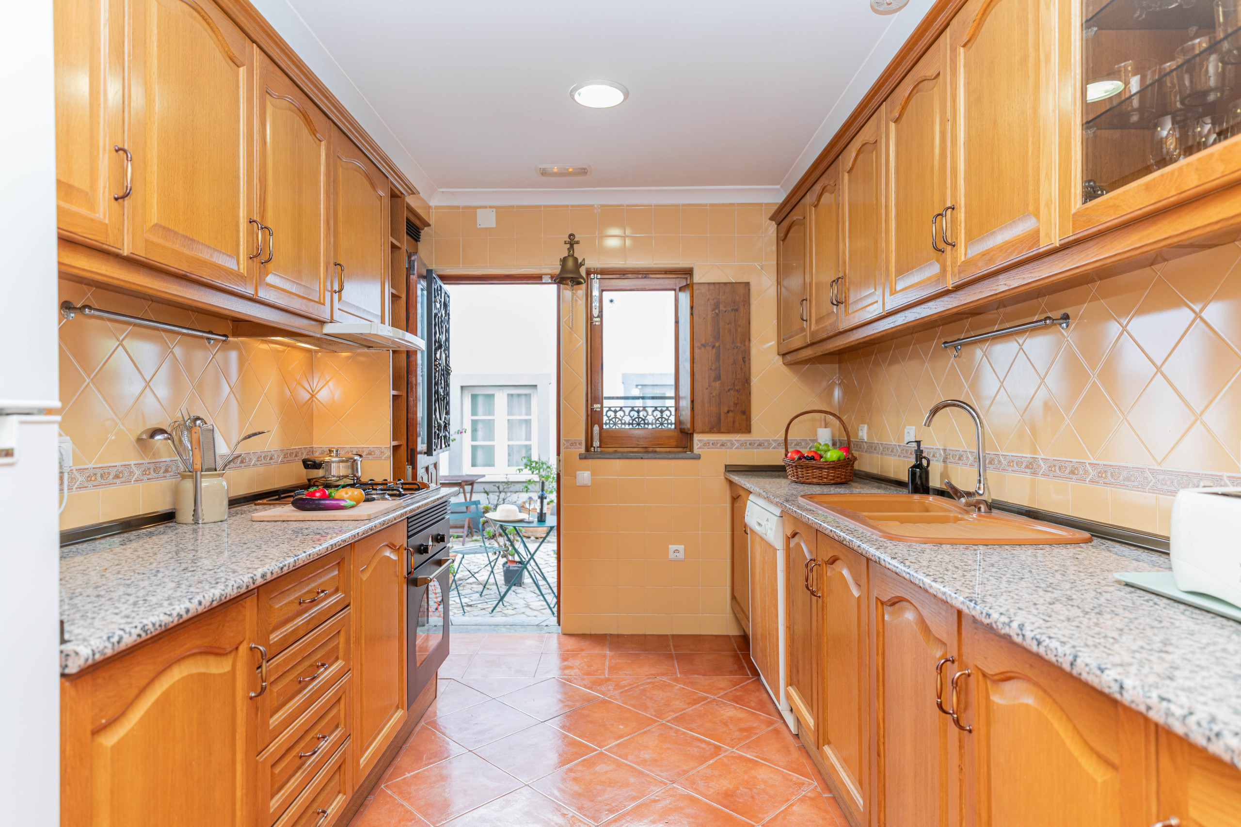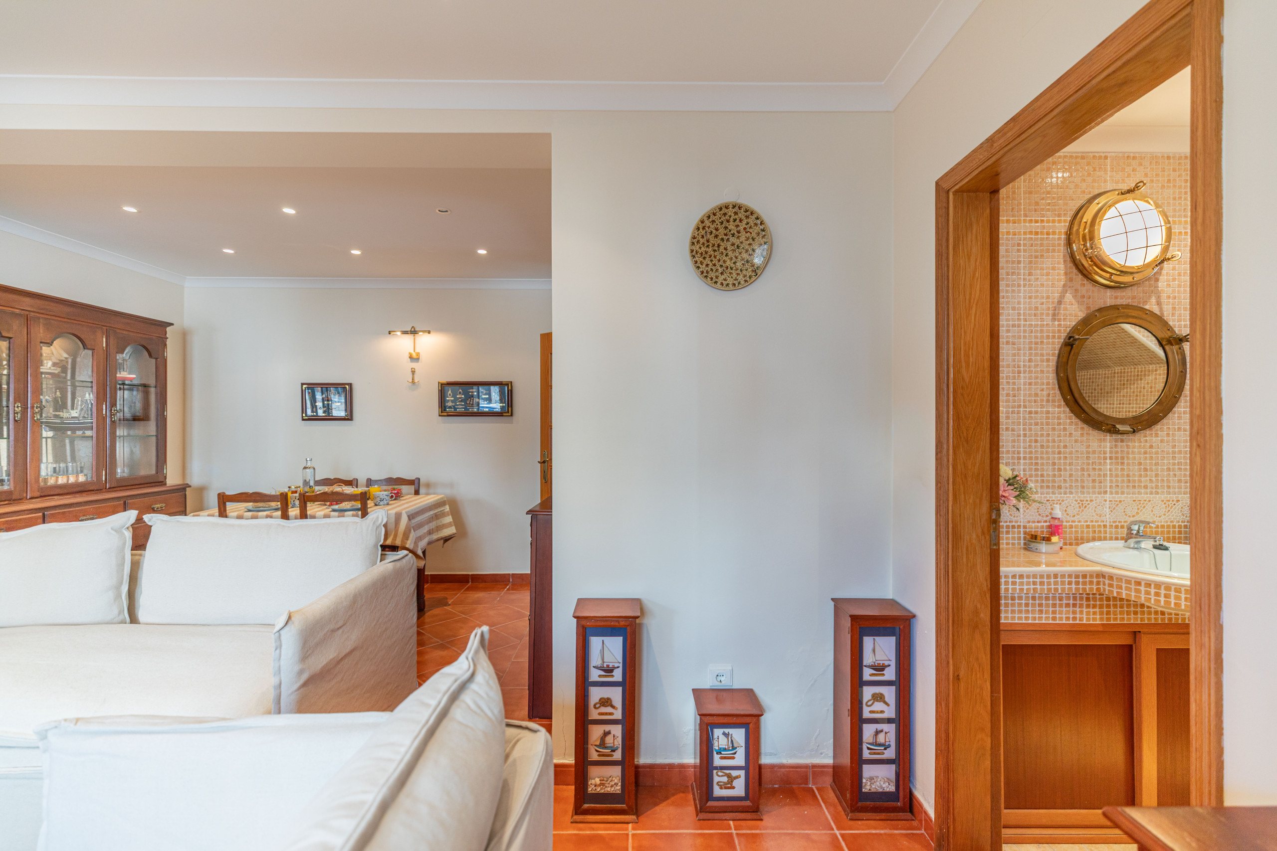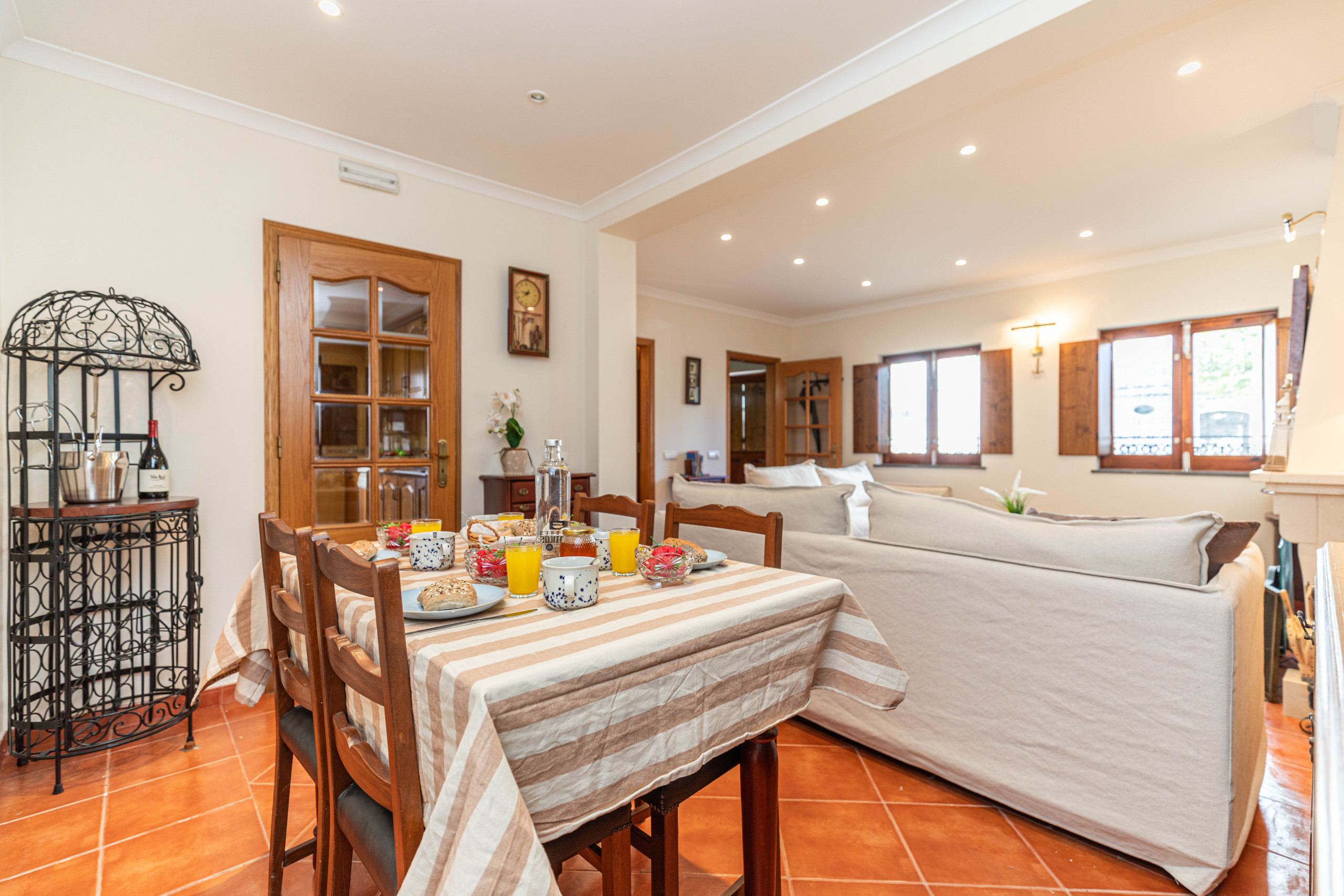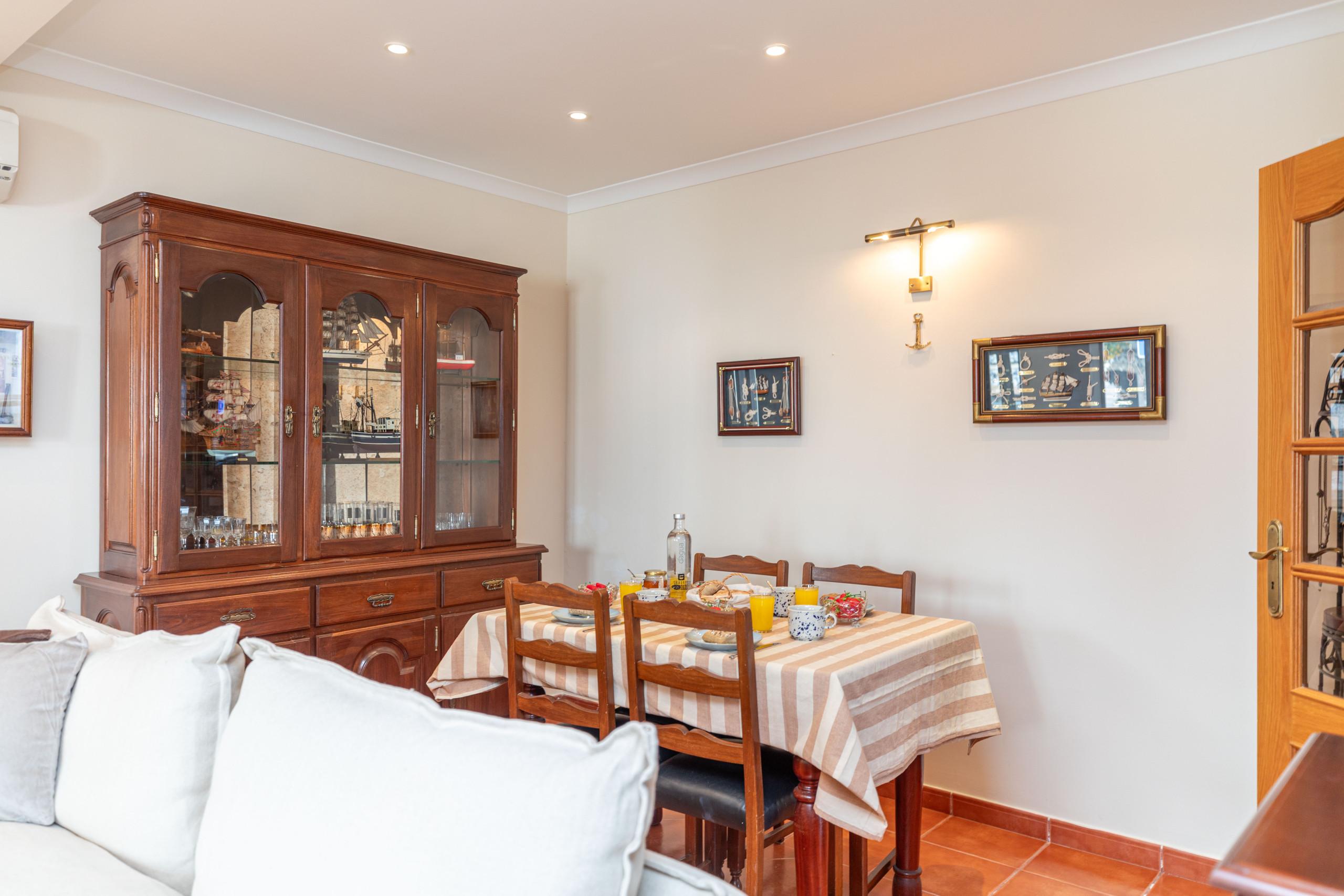 Step inside off the street to be greeted by a spacious open-plan living and dining area. Here, you can unwind in comfort, with unlimited Wi-Fi and access to 180 European TV channels. The room's stunning decorative wall tiles, depicts a scene of the house adding a touch of traditional charm that sets the tone for your stay. For guests enjoying an extended stay, the dining table makes a perfect work station for those who need to work on line!