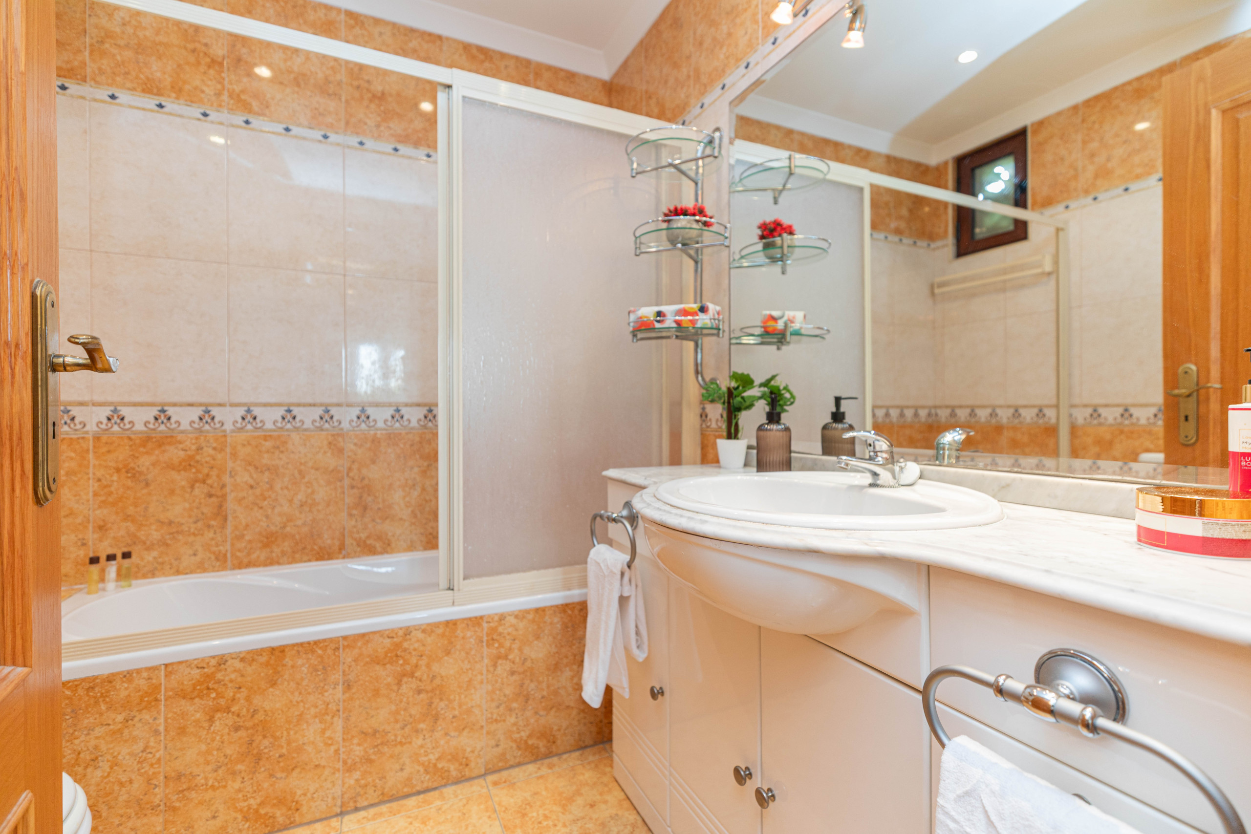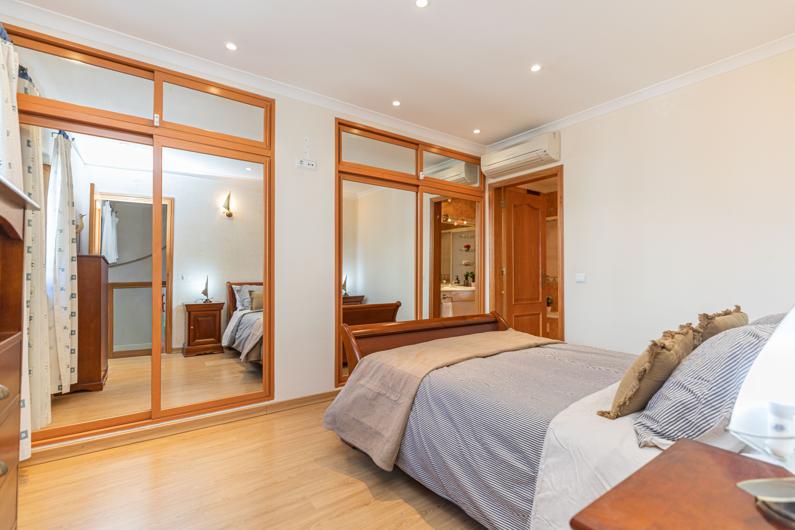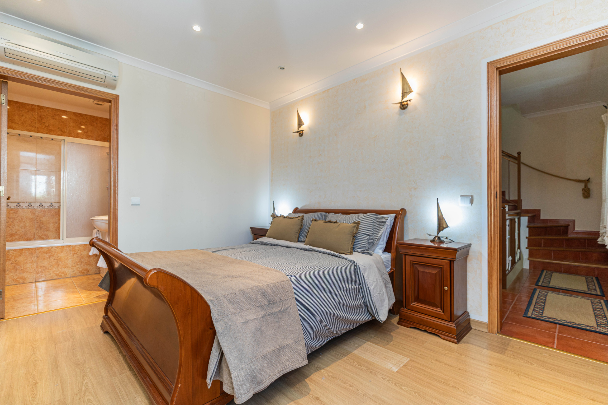 Two bedrooms on the first and second floors provide a peaceful retreat with air conditioning, fitted wardrobes, and cosy king-size beds. Each has a private bathroom—one with a walk-in shower, the other with a bathtub and overhead shower—ensuring comfort and privacy.