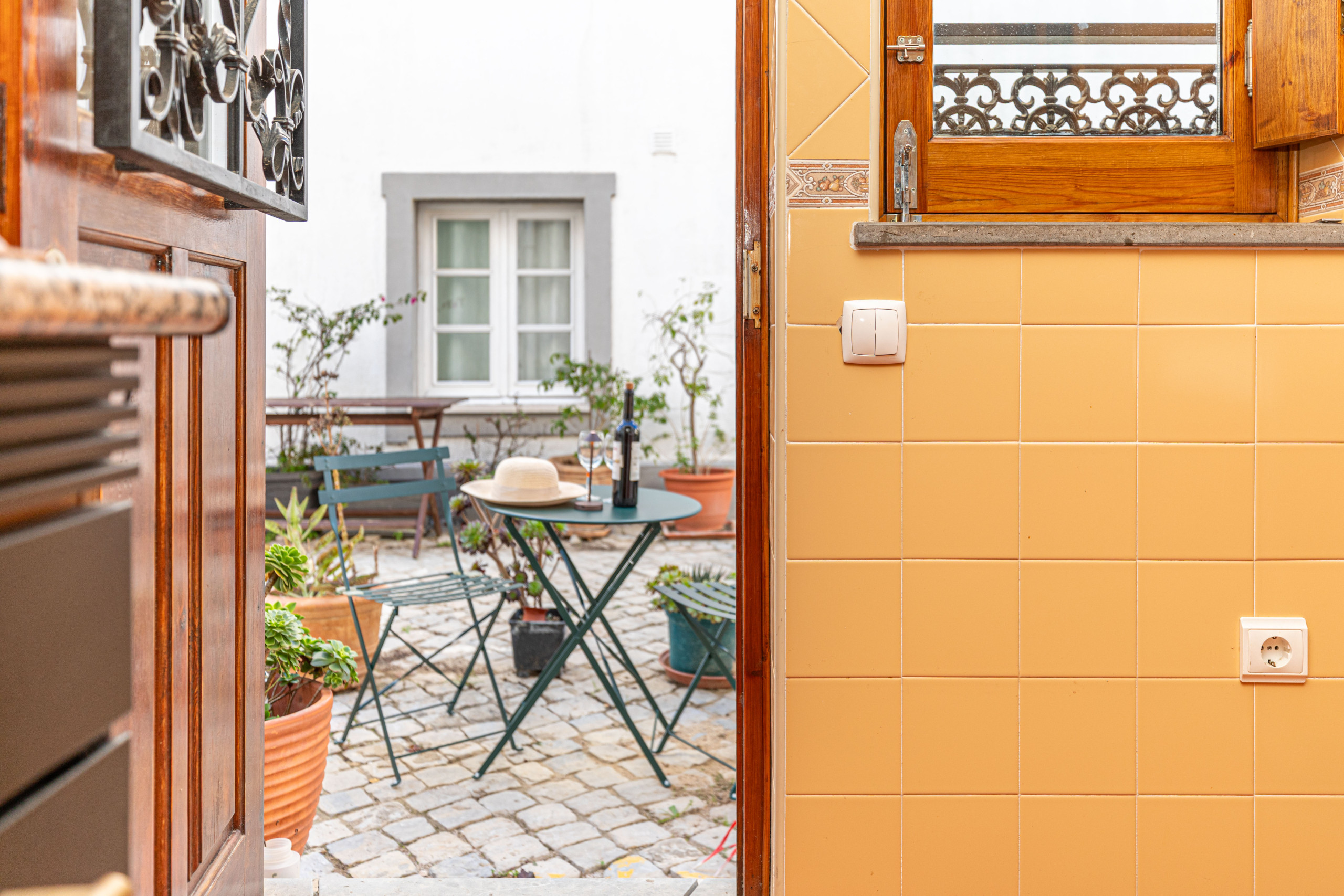Enjoy a small balcony overlooking the charming rooftops of Tavira, perfect for a leisurely breakfast or a glass of wine at sunset. At street level, a quaint table and chairs provide a small outdoor spot to soak up the local atmosphere.