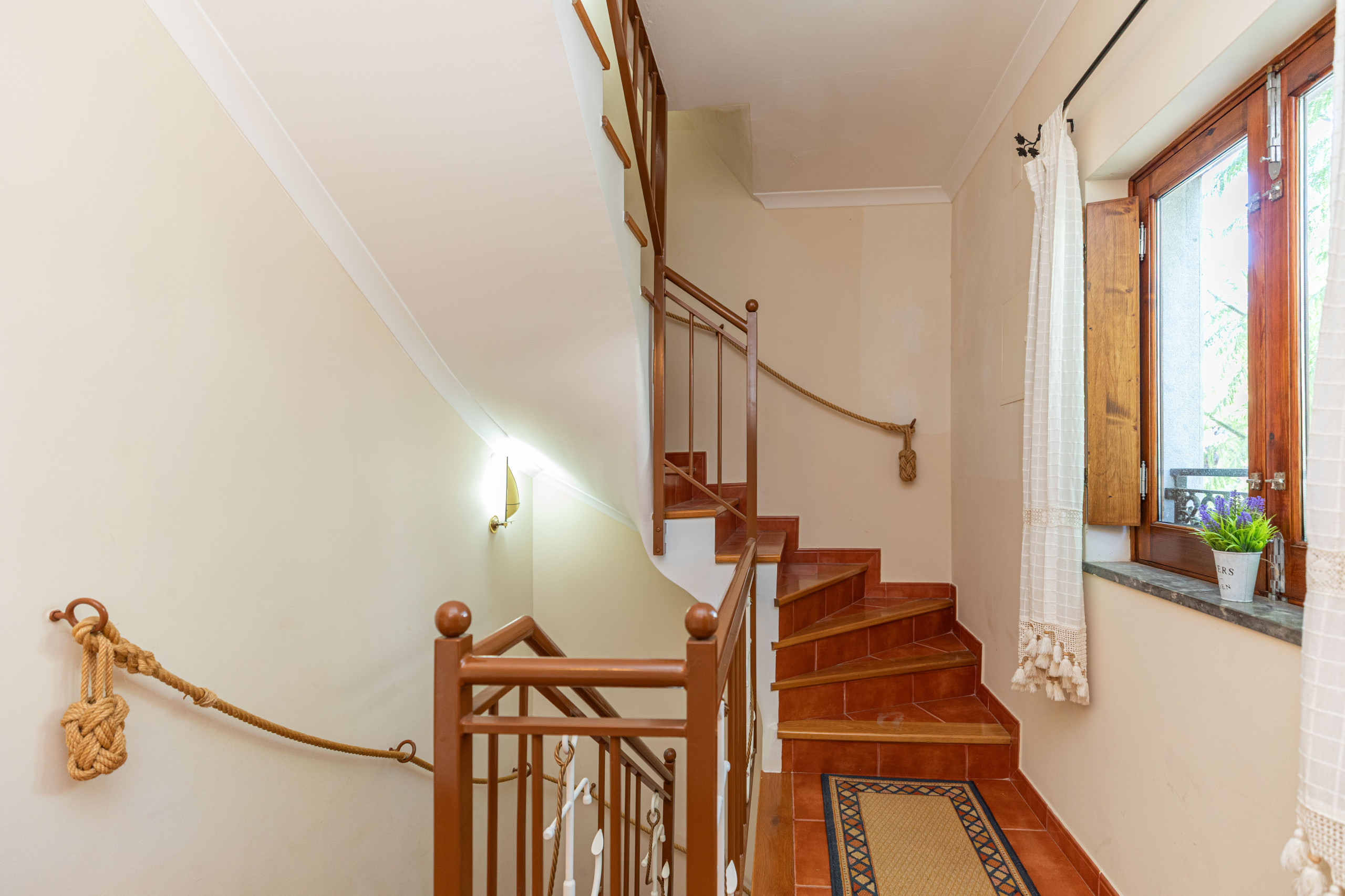 Ascend to the first floor to find a traditional kitchen and the inviting master bedroom. The kitchen, with its rustic decor, is equipped with an electric hob, air fryer oven, and coffee machine. (The washing machine is located on the second floor.) The master bedroom features a Juliet balcony with views over the historical street below, fitted wardrobes and a vanity unit. The shared bathroom on this floor offers a bathtub with an overhead shower, adorned with stunning blue tiles.