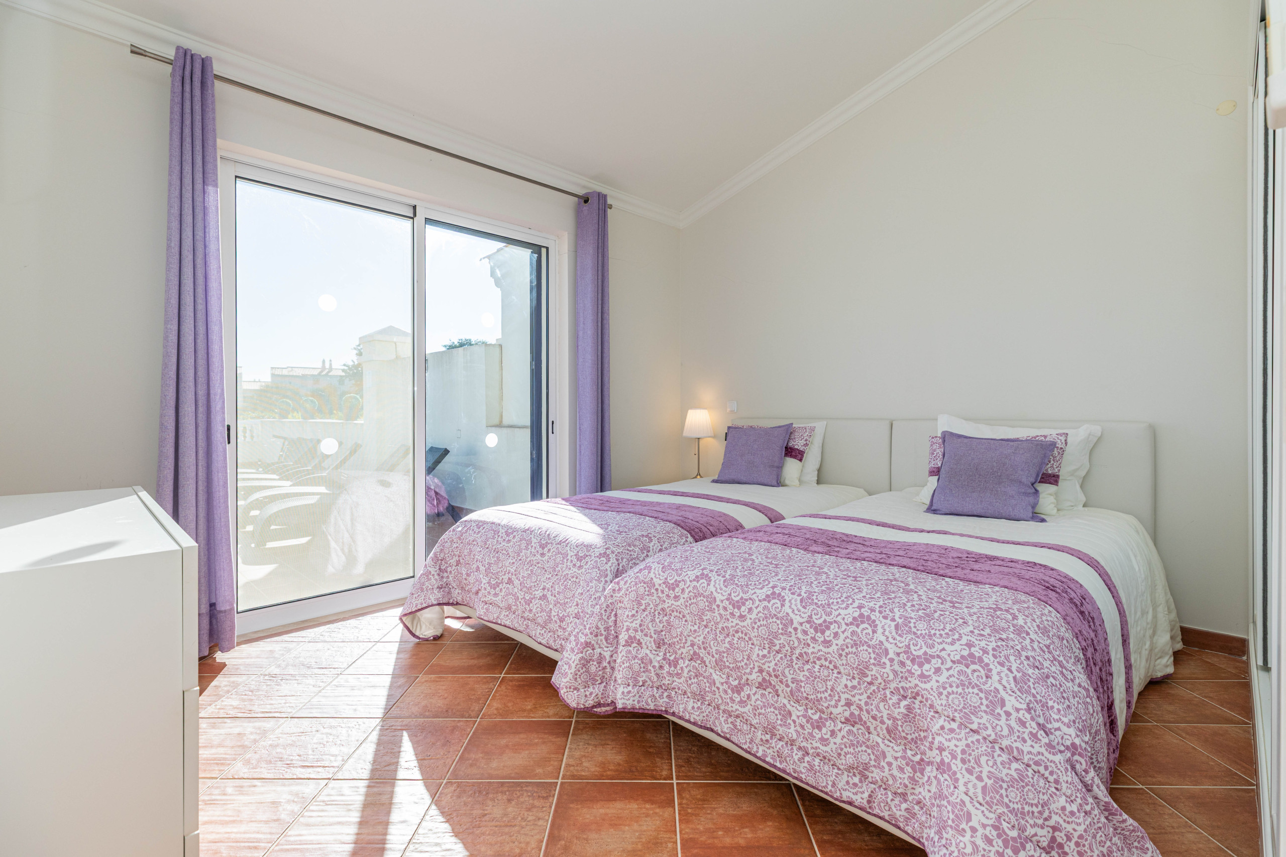 This spacious three-bedroom link-villa offers a welcoming and practical living space. The fully equipped kitchen, with polished black marble worktops, opens onto a large wooden dining table, ideal for shared meals. The cosy lounge features two sofas and a relaxed atmosphere, perfect for unwinding. Two ground-floor bedrooms have flexible single beds that can be joined or separated, each with a private ensuite bathrooms. The master suite occupies the entire first floor, with a balcony overlooking the pool and a bathroom with separate shower and bathtub.