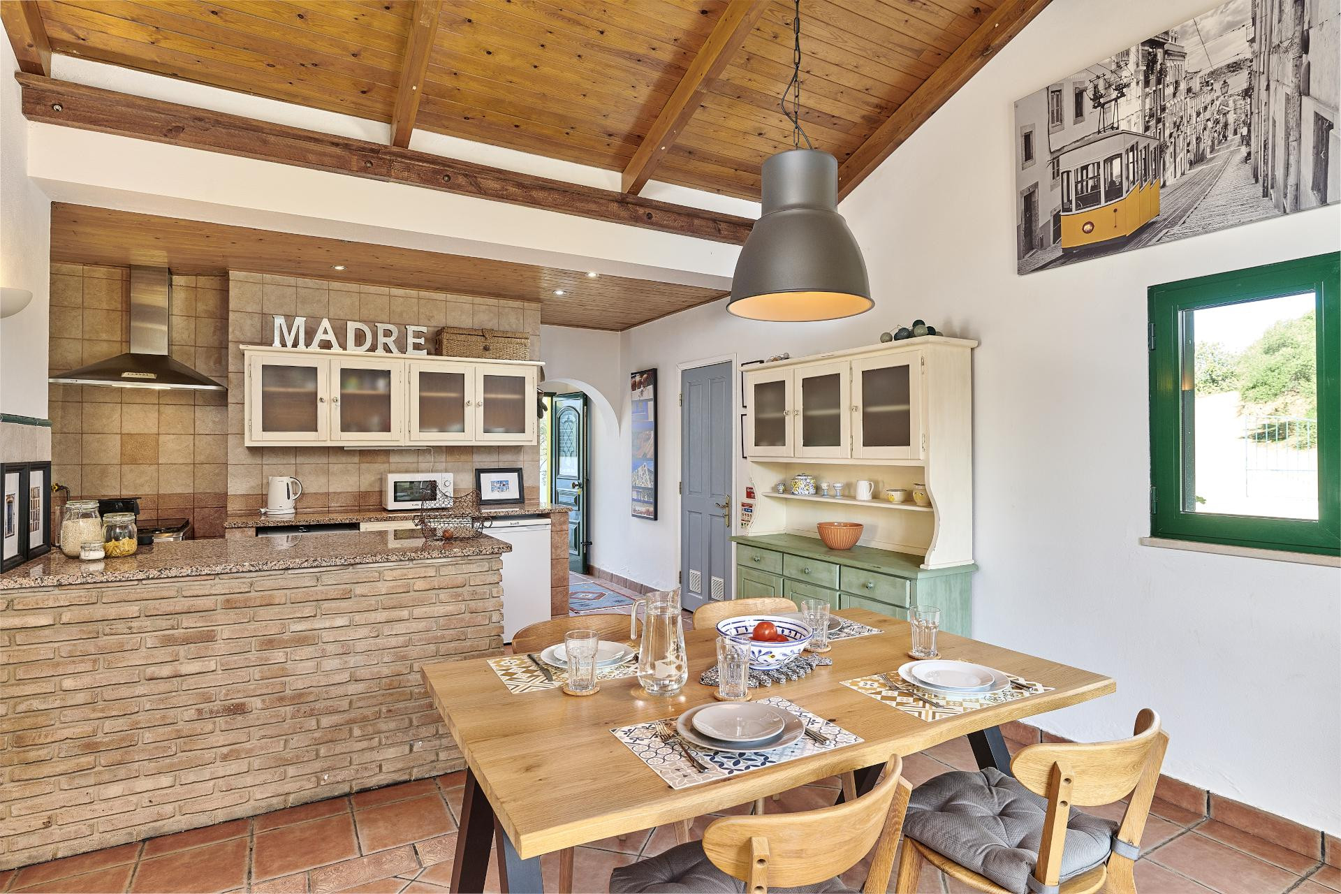 Casa Brisa do Rio is a charming two-level villa designed in a traditional farmhouse style. The open-plan ground floor features a well-equipped kitchen with classic farmhouse details, leading through a graceful archway to the oak dining area, perfect for breakfasts or indoor dining. Beyond the dining space, the lounge provides comfortable sofas, ideal for relaxing or reading. The villa is equipped with a mix of Portuguese and English-speaking channels on the TV, and reliable Wi-Fi throughout ensures you can stay connected even in this peaceful, secluded location.